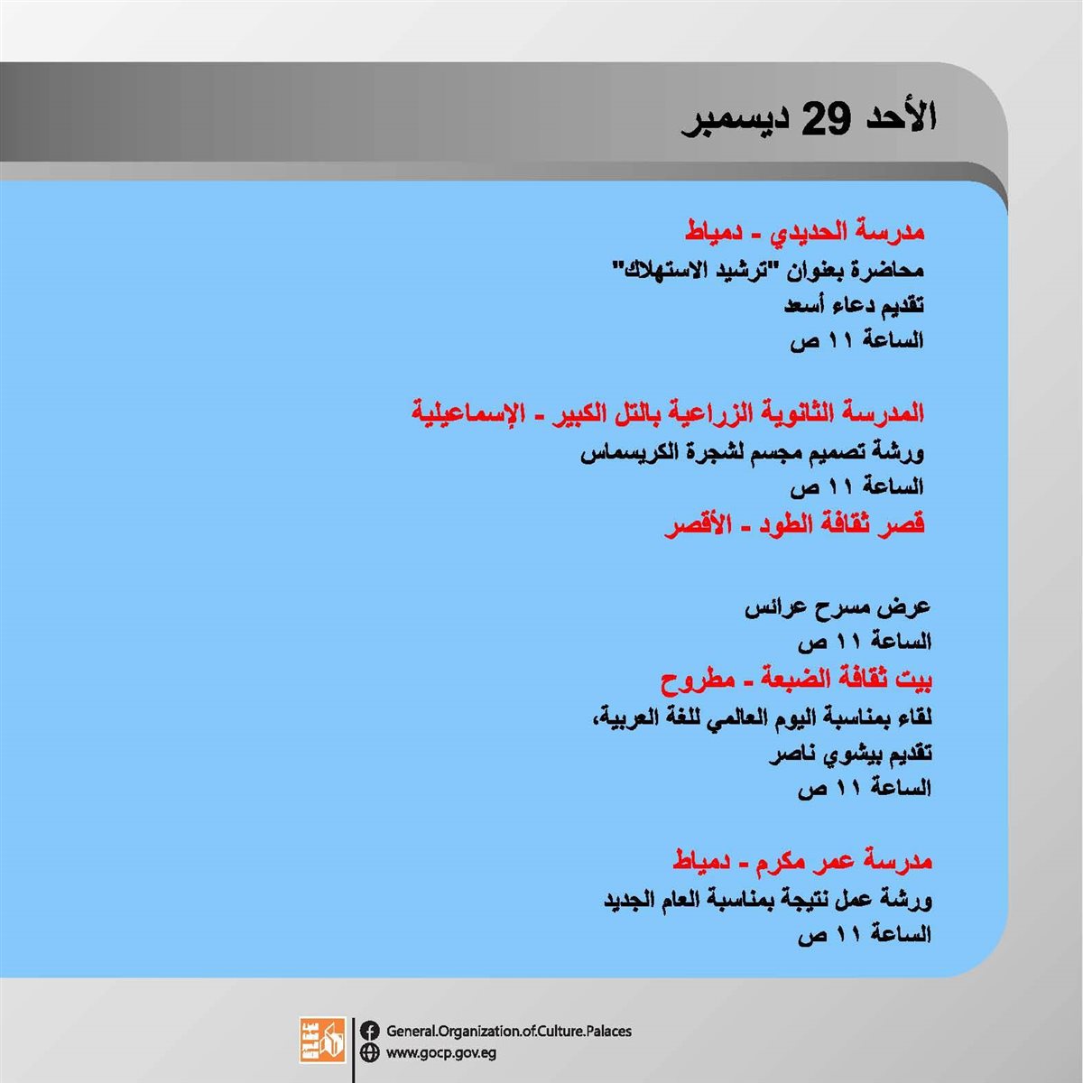 وتحفل الأجندة بمجموعة من المحاضرات واللقاءات الأدبية بمشاركة لفيف من المثقفين والشعراء، هذا بالإضافة الورش الفنية والحرفية، والفعاليات المقامة بمناسبة الاحتفال باليوم العالمي للغة العربية، وعيد الشرطة المصرية.