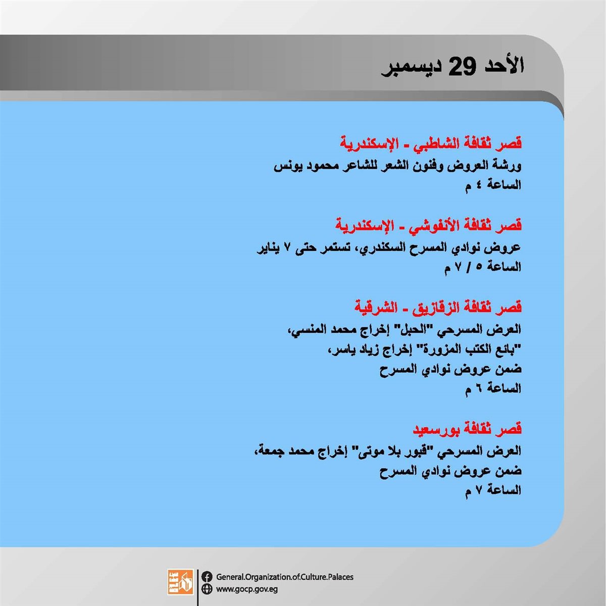 وتقدم العروض المسرحية بمحافظة الإسكندرية يوميا حتى ٧ يناير، على مسرح قصر ثقافة الأنفوشي، ويستقبل قصر ثقافة الزقازيق العروض المسرحية الخاصة بمحافظات إقليم شرق الدلتا الثقافي حتى ١٢ يناير.