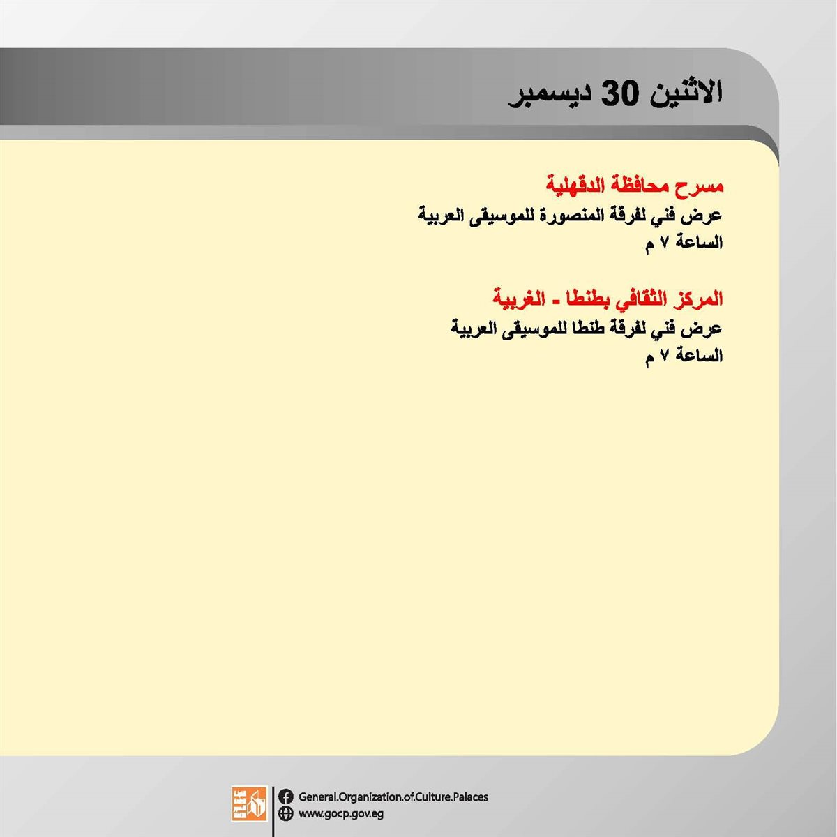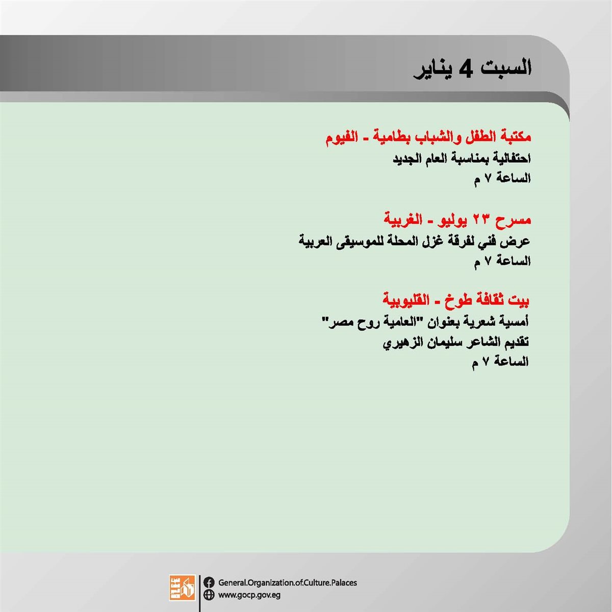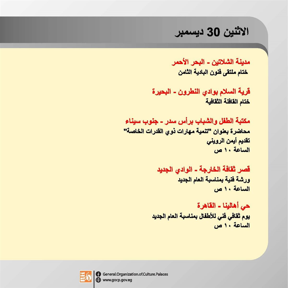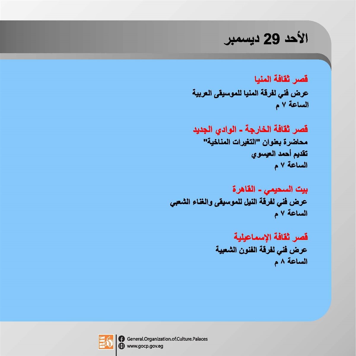 ضمن برامج وزارة الثقافة، وبرعاية الدكتور أحمد فؤاد هنو، وزير الثقافة، تقدم الهيئة العامة لقصور الثقافة، أجندة حافلة بالفعاليات الثقافية والفنية، بدءا من اليوم الأحد وحتى السبت المقبل 4 يناير، بإشراف الكاتب محمد ناصف، نائب رئيس الهيئة.