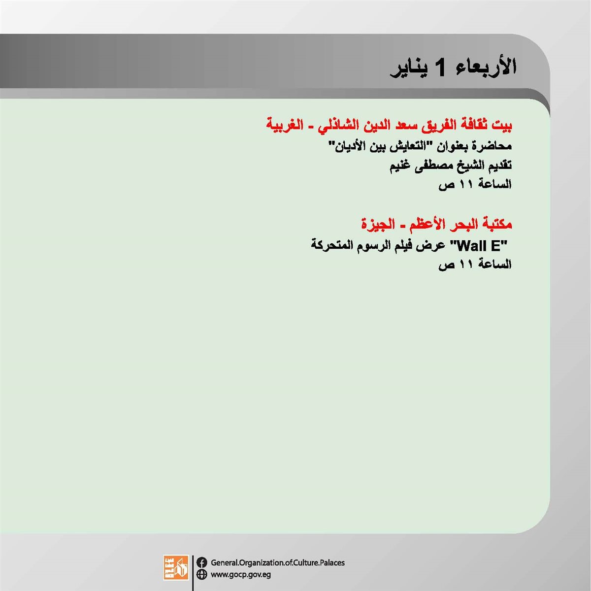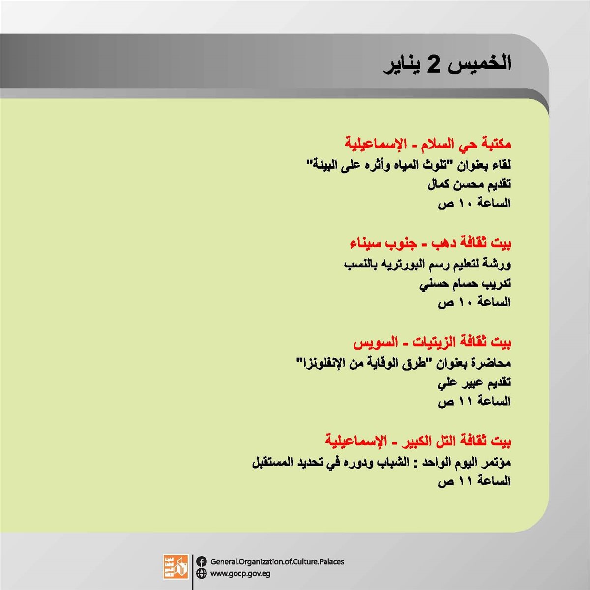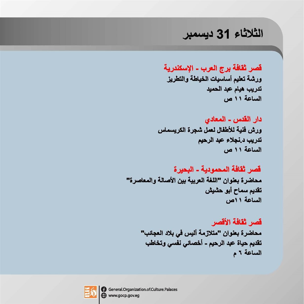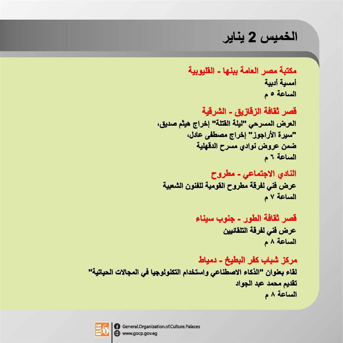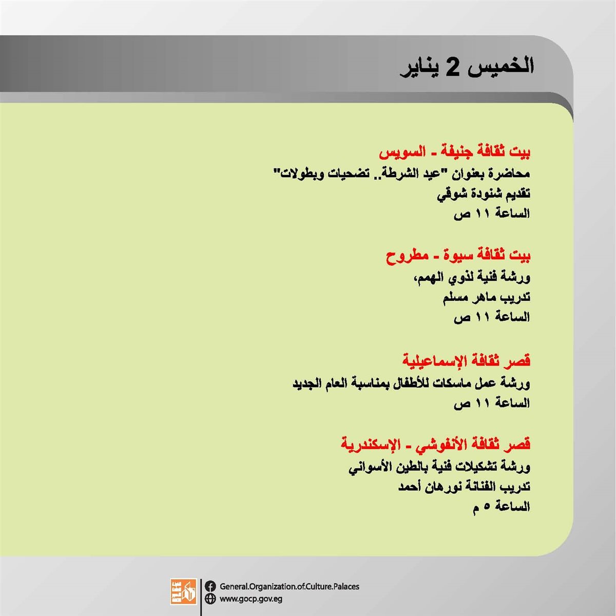 تستقبل الهيئة العامة لقصور الثقافة العام الجديد بباقة من الأنشطة الثقافية والفنية، تتنوع ما بين اللقاءات التثقيفية، العروض الفنية والفقرات الترفيهية والاستعراضية بجانب ورش الحكي، والمشغولات اليدوية.