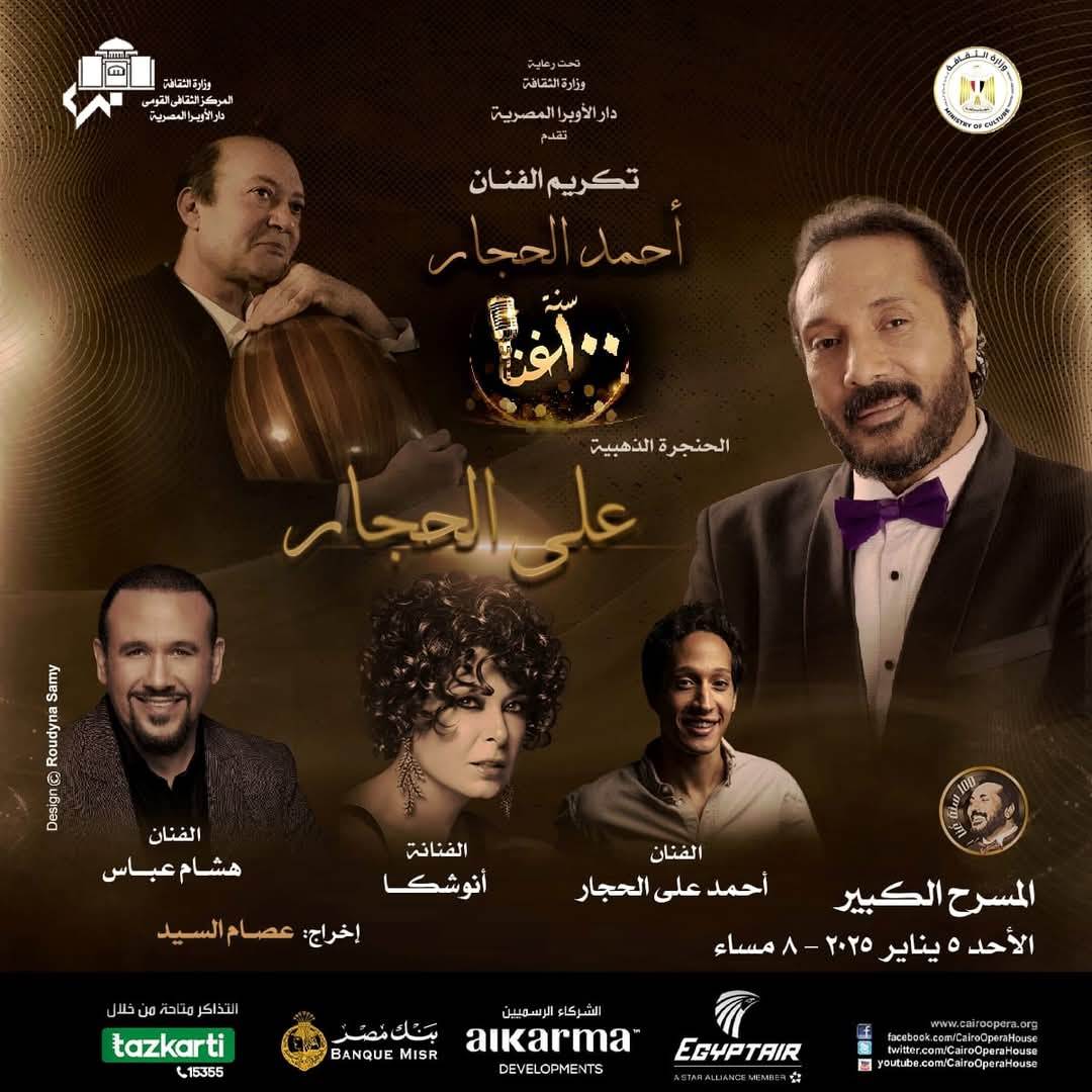 ضمن خطة نشاط وزارة الثقافة، وتحت رعاية الدكتور أحمد فؤاد هنو وزير الثقافة تواصل دار الأوبرا المصرية برئاسة الدكتورة لمياء زايد، سلسلة عروض المشروع الفنى "100 سنة غنا" الذي يقام بالتعاون مع النجم على الحجار حيث تستهل العام الجديد 2025 بأمسية لتكريم إسم الفنان الراحل أحمد الحجار بمشاركة النجمين أنوشكا، هشام عباس والواعد أحمد علي الحجار ومن إخراج عصام السيد وذلك فى الثامنة مساء الأحد 5 يناير 2025 على المسرح الكبير.
