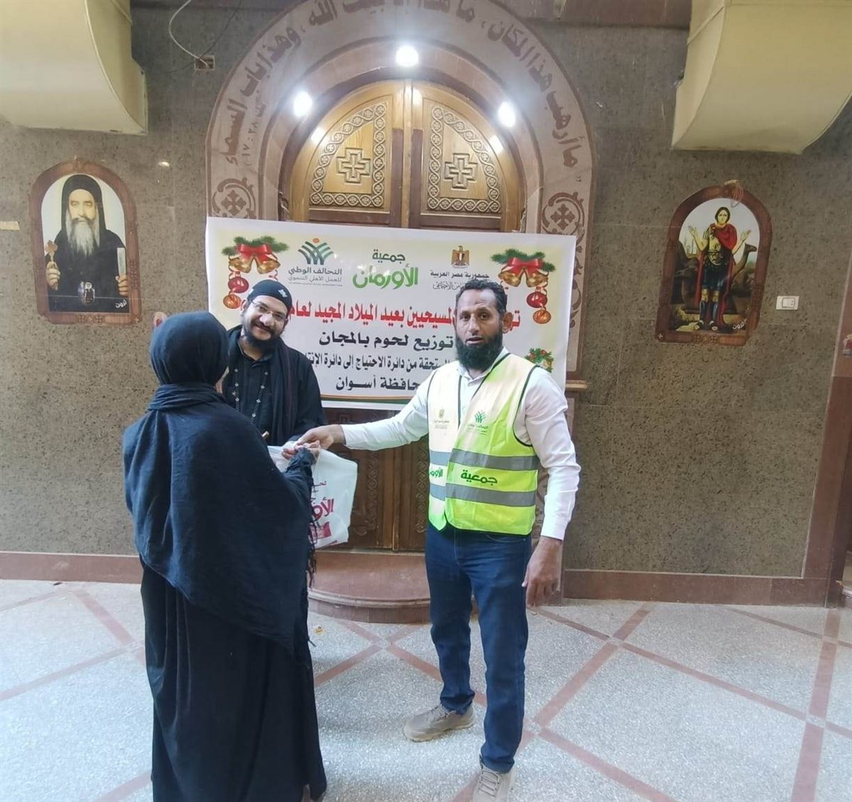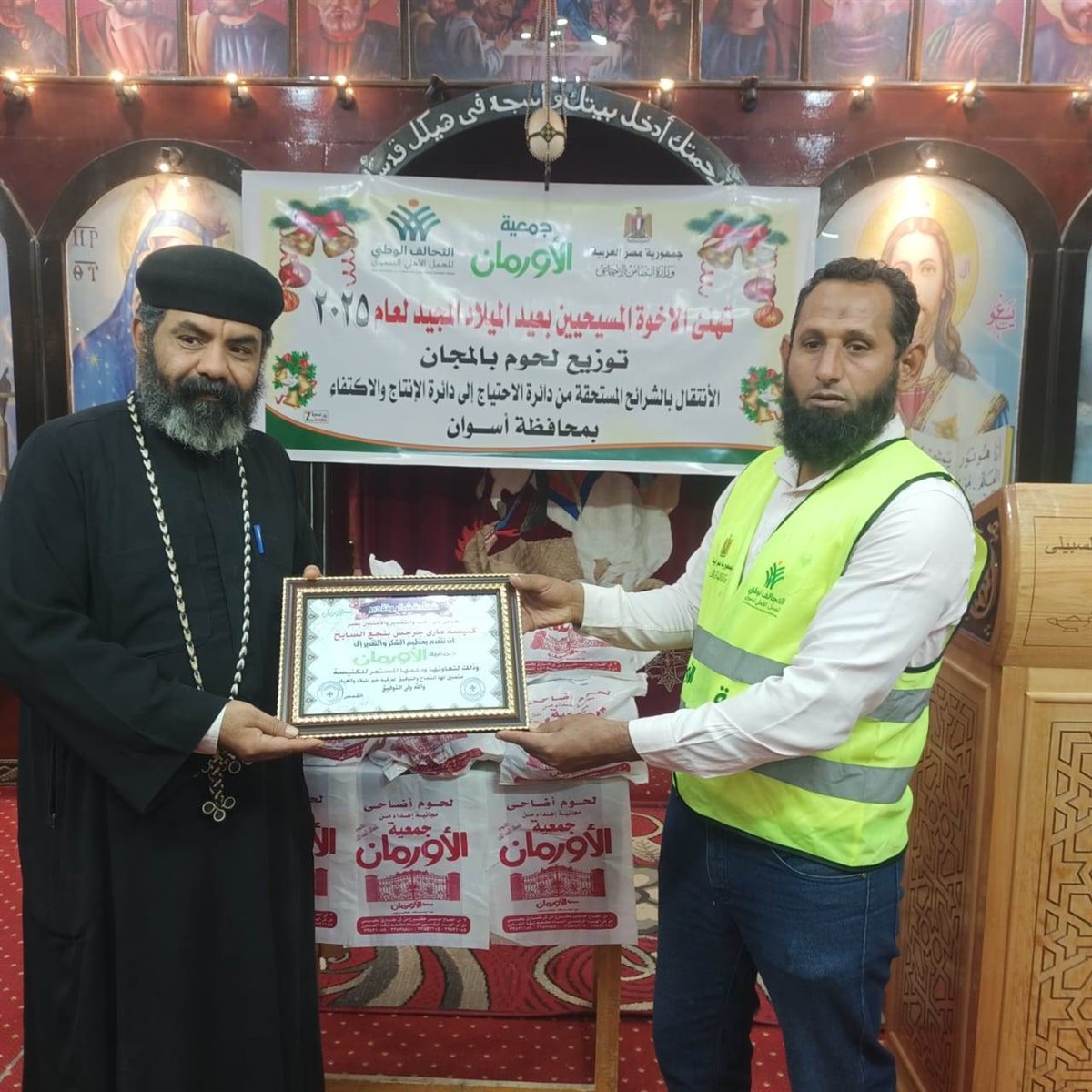 شاركت مديرية التضامن الاجتماعي بأسوان جمعية الأورمان فى تنظيم احتفالية كبرى لتوزيع عدد 1000 كيلو لحوم مجانأ على غير القادرين بكنيسة ماري مينا المعمارية ومار جرجس بنجع السايح وكنيسة العذراء مريم بالبحيرة وكنيسة ماري مرقص بالشماخيه وكنيسة الشهيد العظيم ابوسفين حاجر القنان بمركز ادفو، وذلك فى إطار الاحتفالات بمناسية العام الميلادى الجديد 2025.