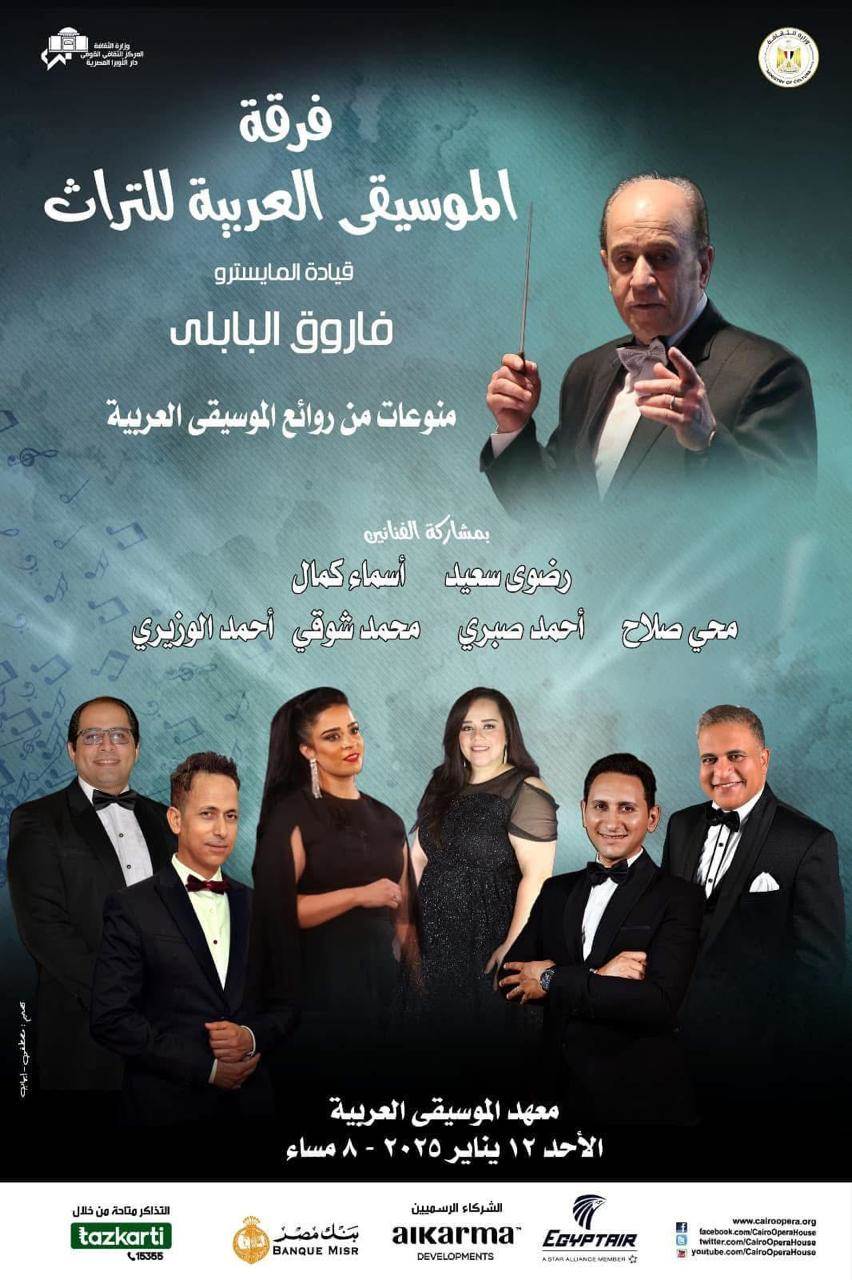 ضمن خطط وزارة الثقافة لحفظ الإرث الفنى تنظم دار الأوبرا المصرية برئاسة الدكتورة لمياء زايد حفلاً لفرقة الموسيقى العربية للتراث بقيادة المايسترو فاروق البابلى وذلك في الثامنة مساء الأحد 12 يناير 2025 على مسرح معهد الموسيقى العربية.
