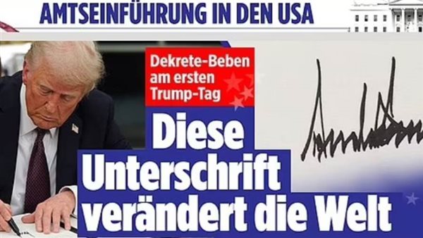 نشرت صحيفة بيلد الألمانية تقريرا بعنوان "التوقيع الذي يغير العالم"، مع التركيز على سلسلة الأوامر التنفيذية التي أصدرها الرئيس السابع والأربعون أمام أعين العالم.