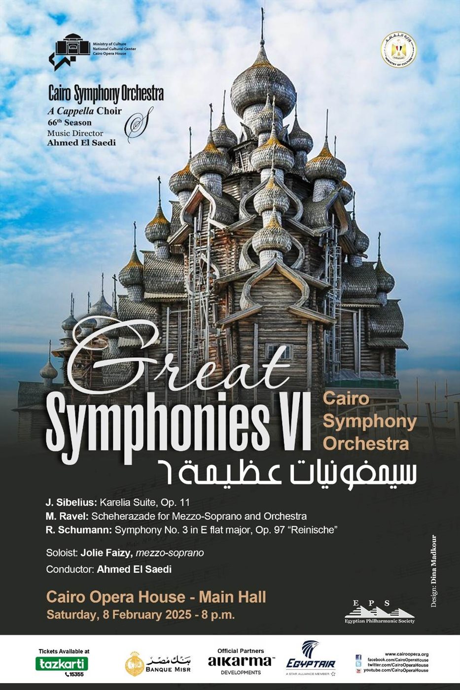 ضمن أنشطة وزارة الثقافة الجادة تواصل دار الأوبرا المصرية برئاسة الدكتورة لمياء زايد تقديم سلسلة أعظم السيمفونيات حيث يقيم أوركسترا القاهرة السيمفوني حفلاً بقيادة المايسترو أحمد الصعيدى، ومشاركة الميتزو سوبرانو جولى فيظى في الثامنة مساء السبت 8 فبراير 2025 على المسرح الكبير.
