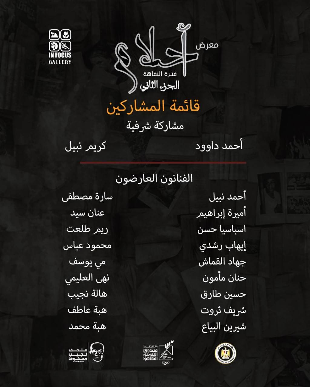يشارك فى المعرض ٢٠ فنانًا فوتوغرافيًا هم: أحمد داوود، كريم نبيل، أحمد نبيل، إسباسيا حسن، أميرة مصطفى، إيهاب رشدى، جهاد القماش، حسين طارق، حنان مأمون، ريم طلعت، سارة مصطفى، شريف ثروت، شيرين البياع، عنان سيد، محمود عباس، مى يوسف، نهى العليمى، هالة نجيب محمد، هبة محمد، وهبة عاطف.