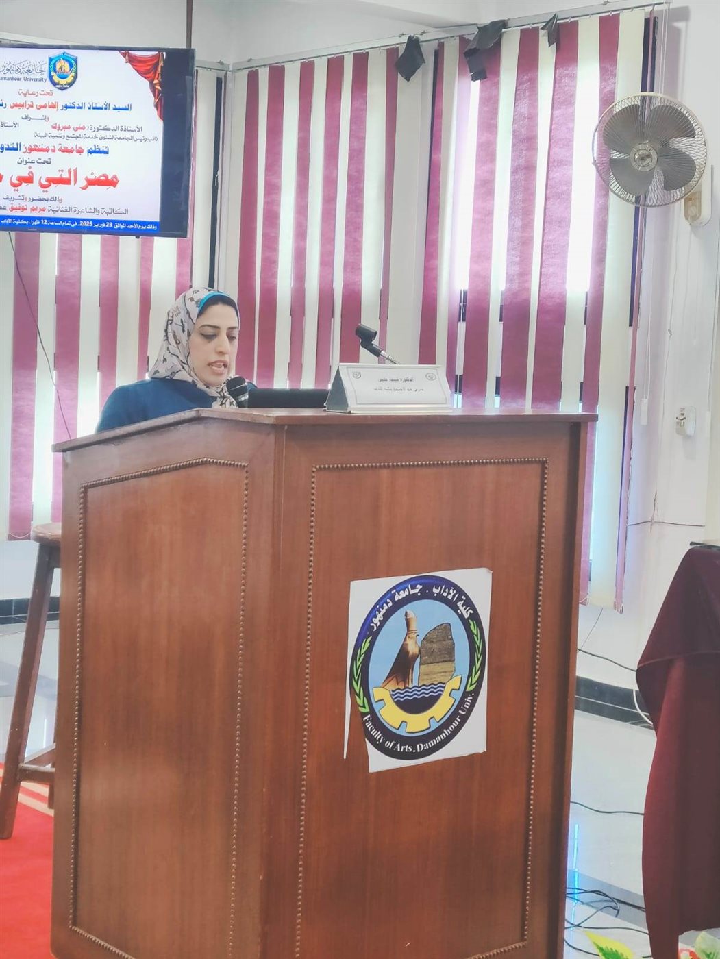 ومن جانبها اعربت الدكتورة سماح الصاوي، عن بالغ سعادتها باستضافة كلية الآداب لمثل هذه الفعاليات الثقافية التوعوية؛ باعتبارها بيت الحكمة و محضن الدراسات الإنسانية والنفسية التي تهتم بالفكر والوجدان والجغرافيا والتاريخ والآثار والفلسة والأدب والثقافة، لافته إلى أهمية تلك الفعاليات في تعزيز الولاء والانتماء لدى الشباب.