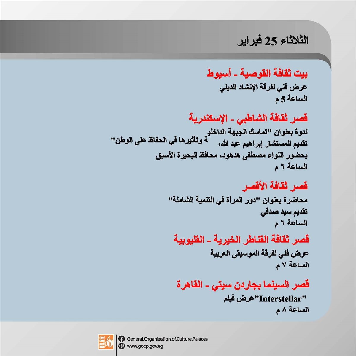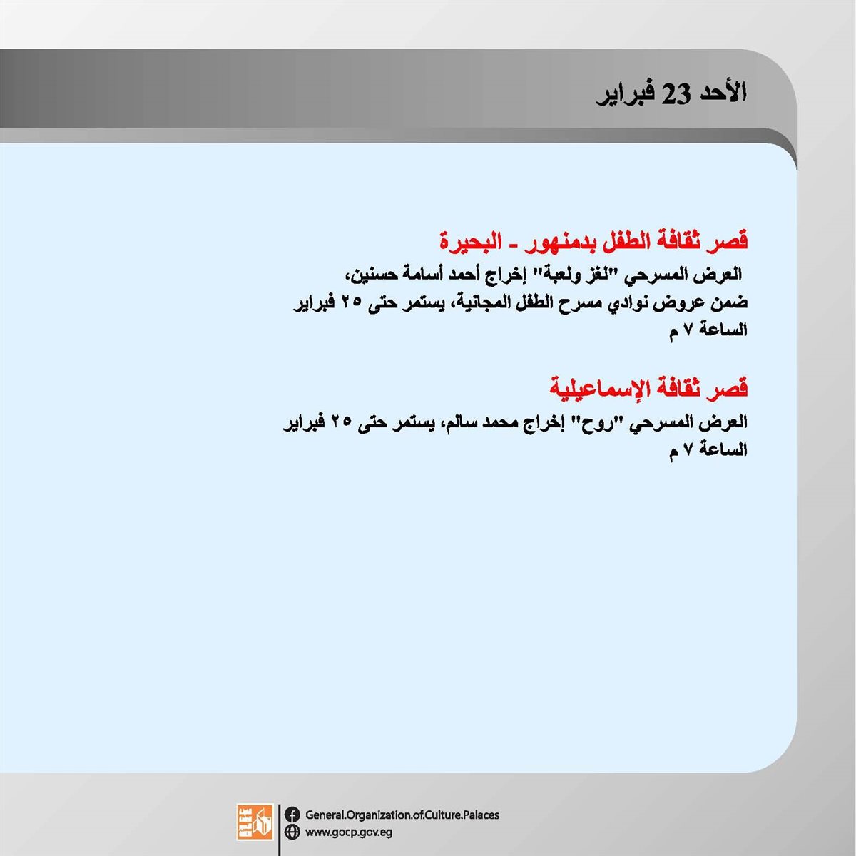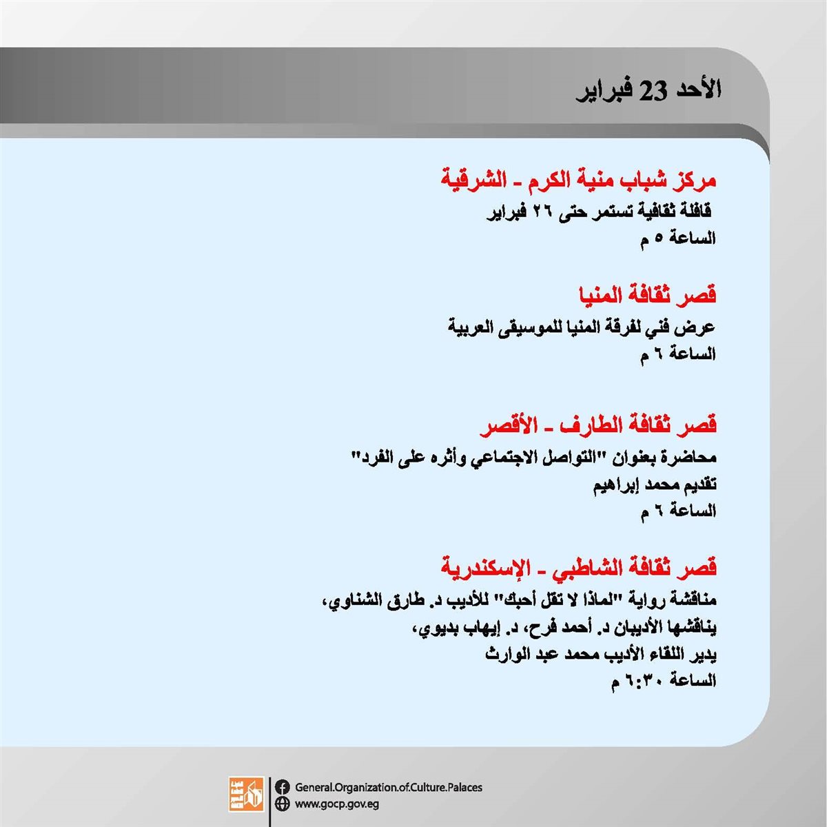 ننشر تفاصيل الأجندة الأسبوعية لهيئة قصور الثقافة