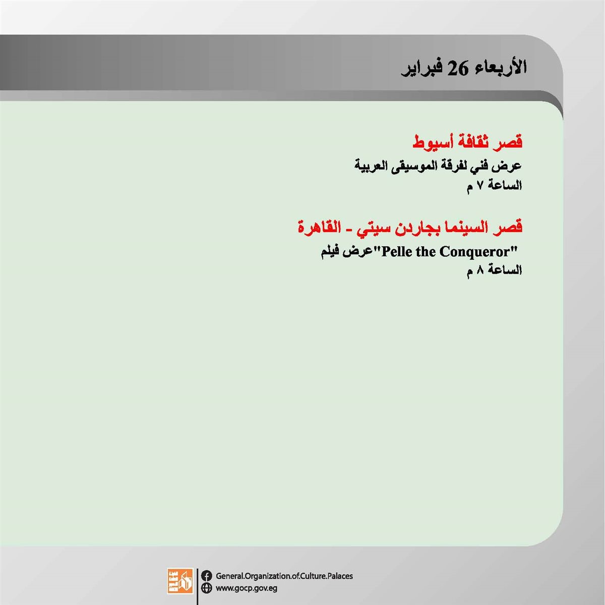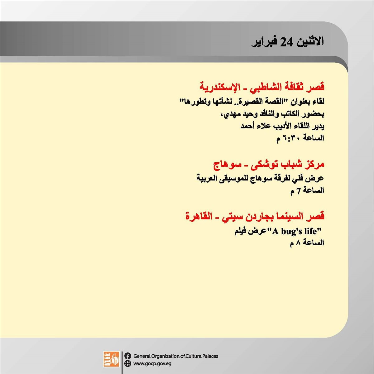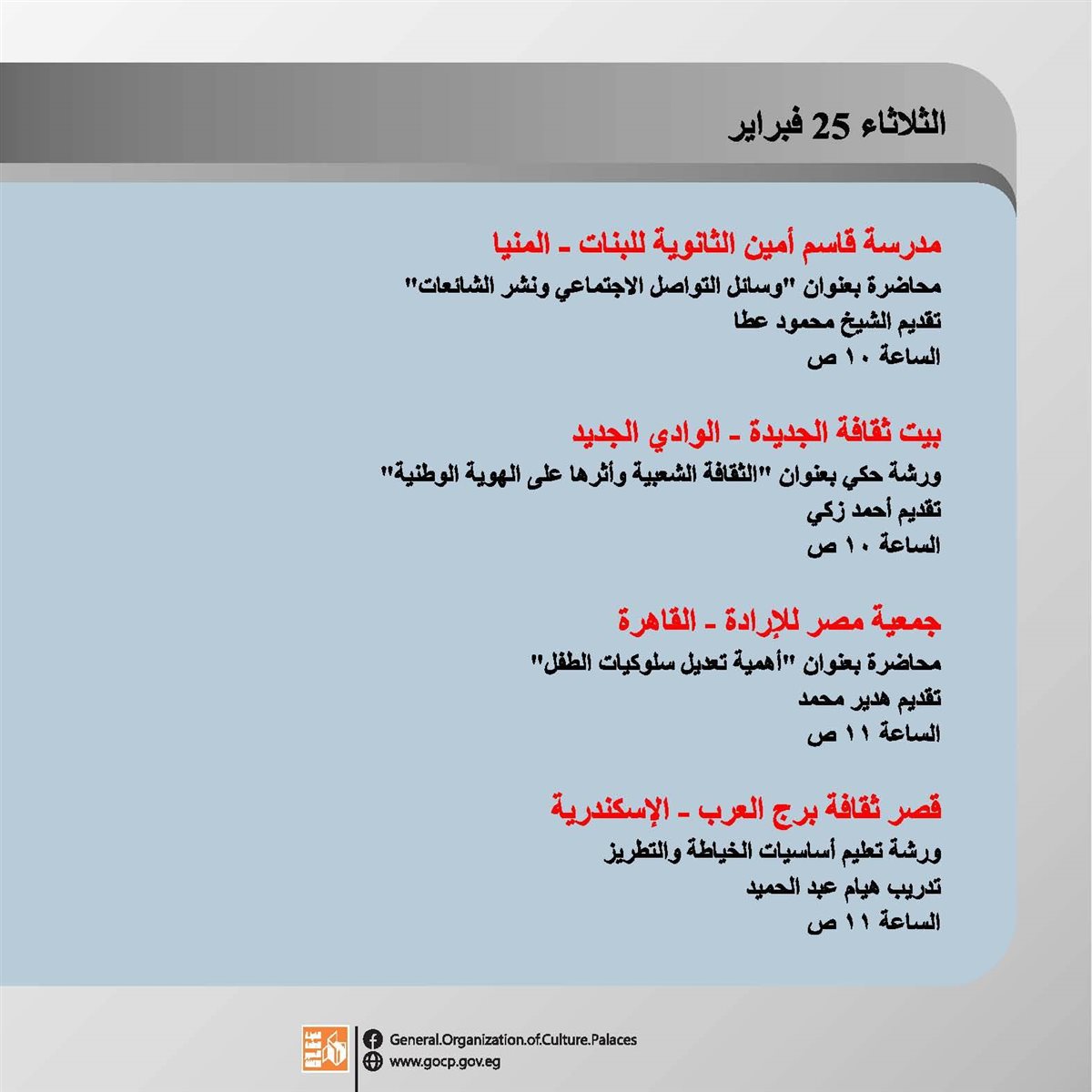 ننشر تفاصيل الأجندة الأسبوعية لهيئة قصور الثقافة