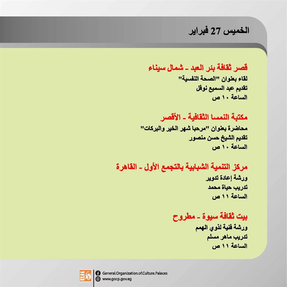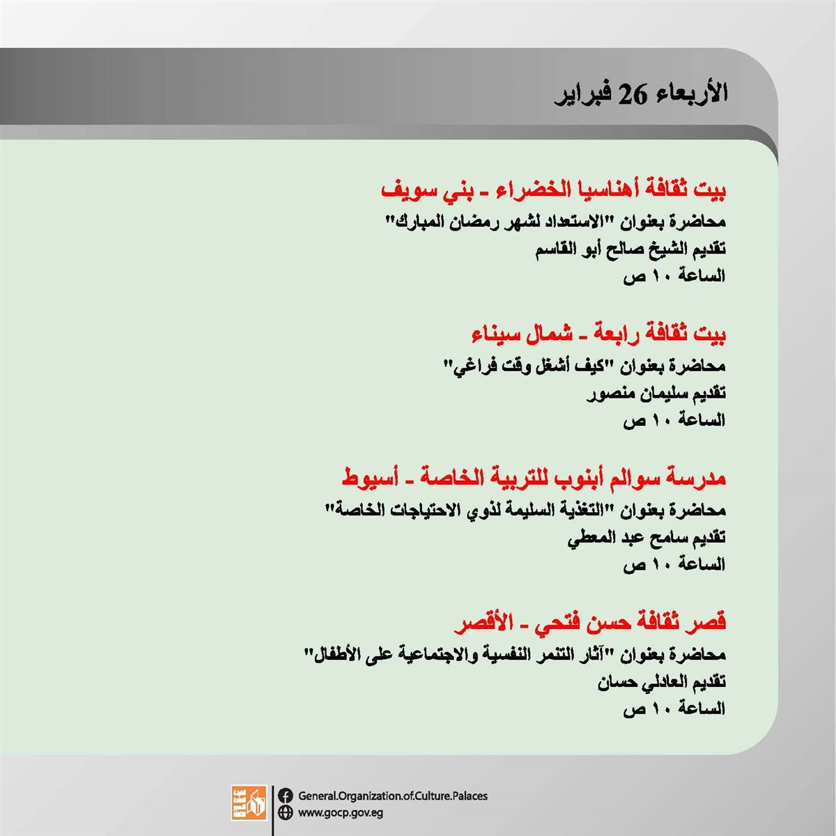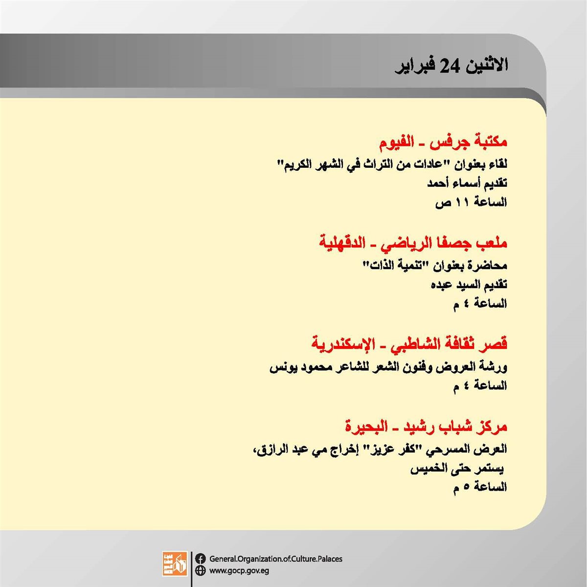 هذا وتحفل الأجندة بباقة متنوعة من اللقاءات التثقيفية والتوعوية، هذا بالإضافة الورش الفنية والحرفية، وعروض الموسيقى العربية والإنشاد الديني، والفعاليات المقامة استعدادا لاستقبال شهر رمضان الكريم.