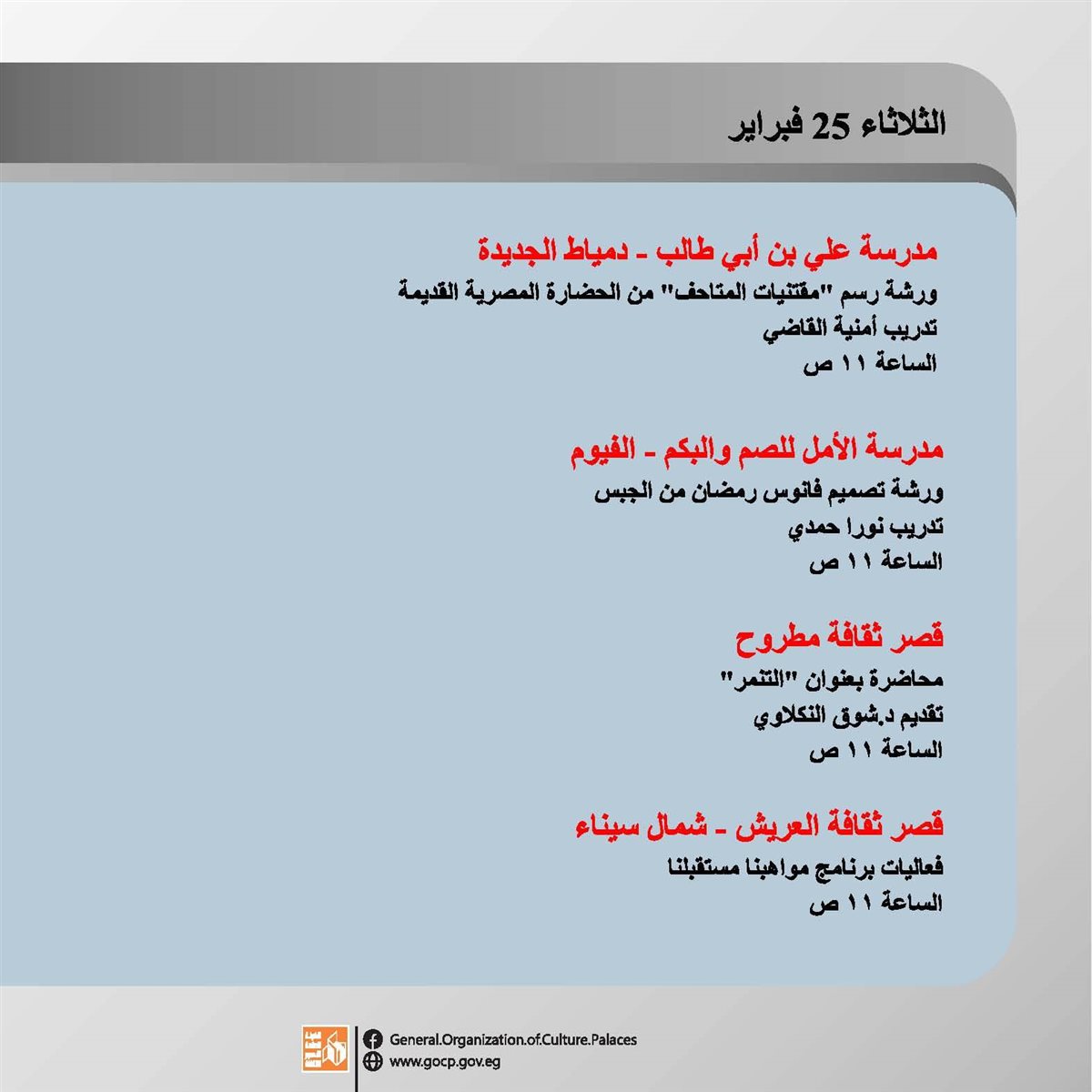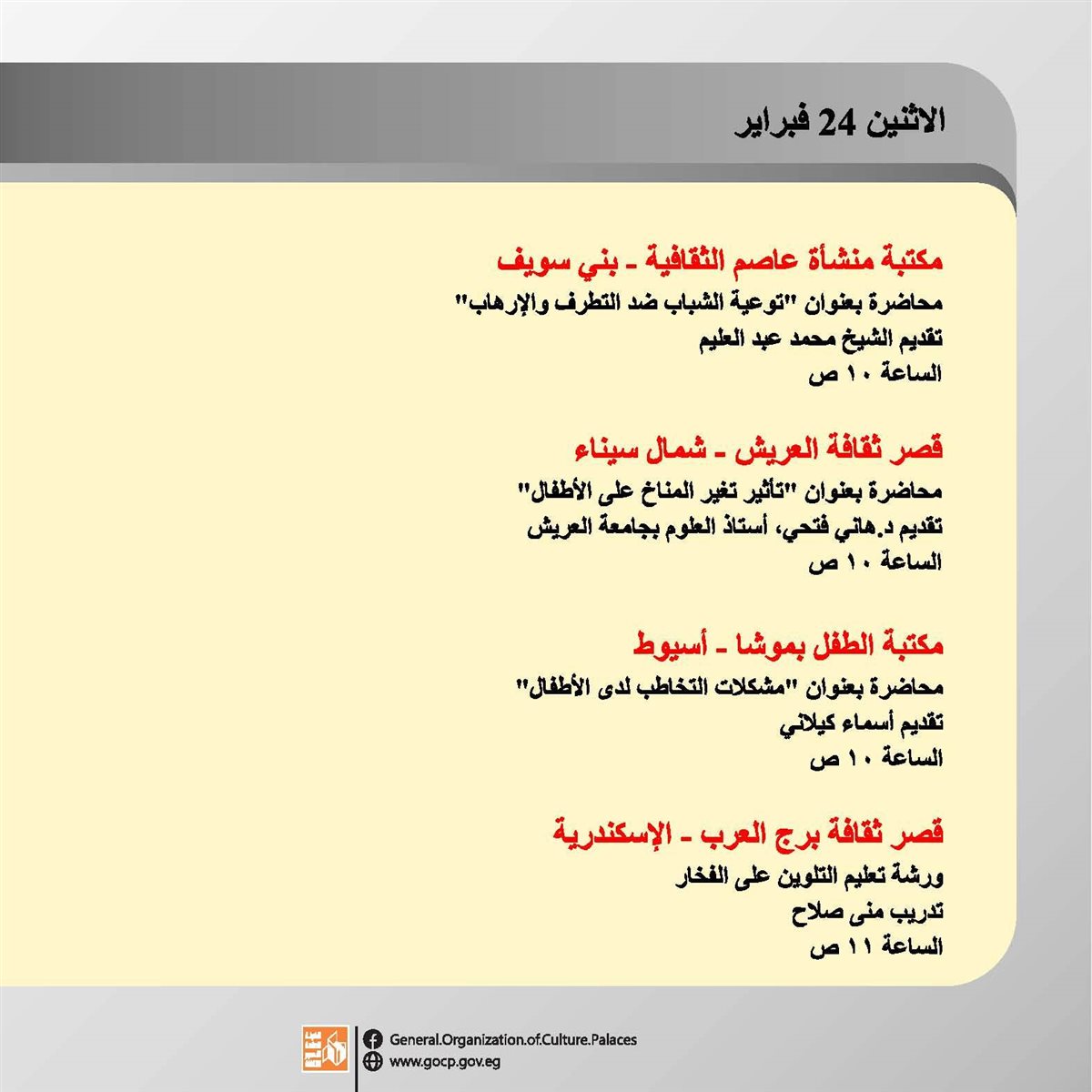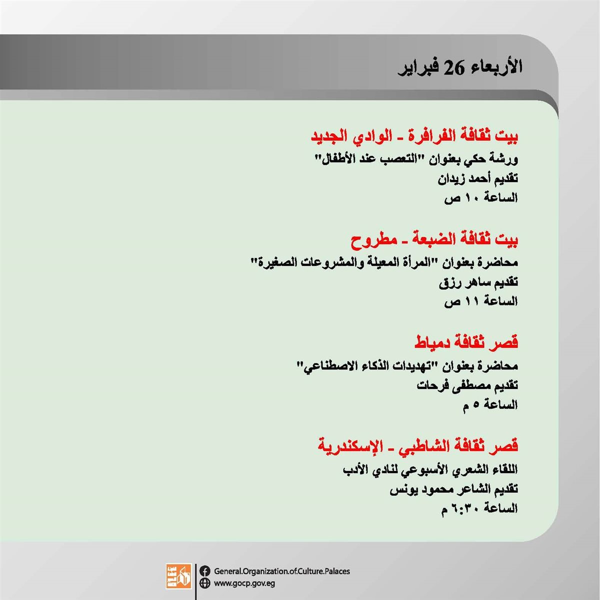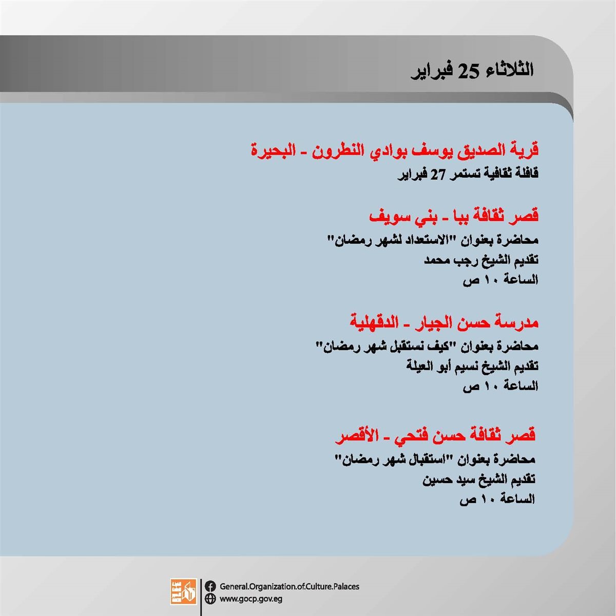 هذا وتحفل الأجندة بباقة متنوعة من اللقاءات التثقيفية والتوعوية، هذا بالإضافة الورش الفنية والحرفية، وعروض الموسيقى العربية والإنشاد الديني، والفعاليات المقامة استعدادا لاستقبال شهر رمضان الكريم.
