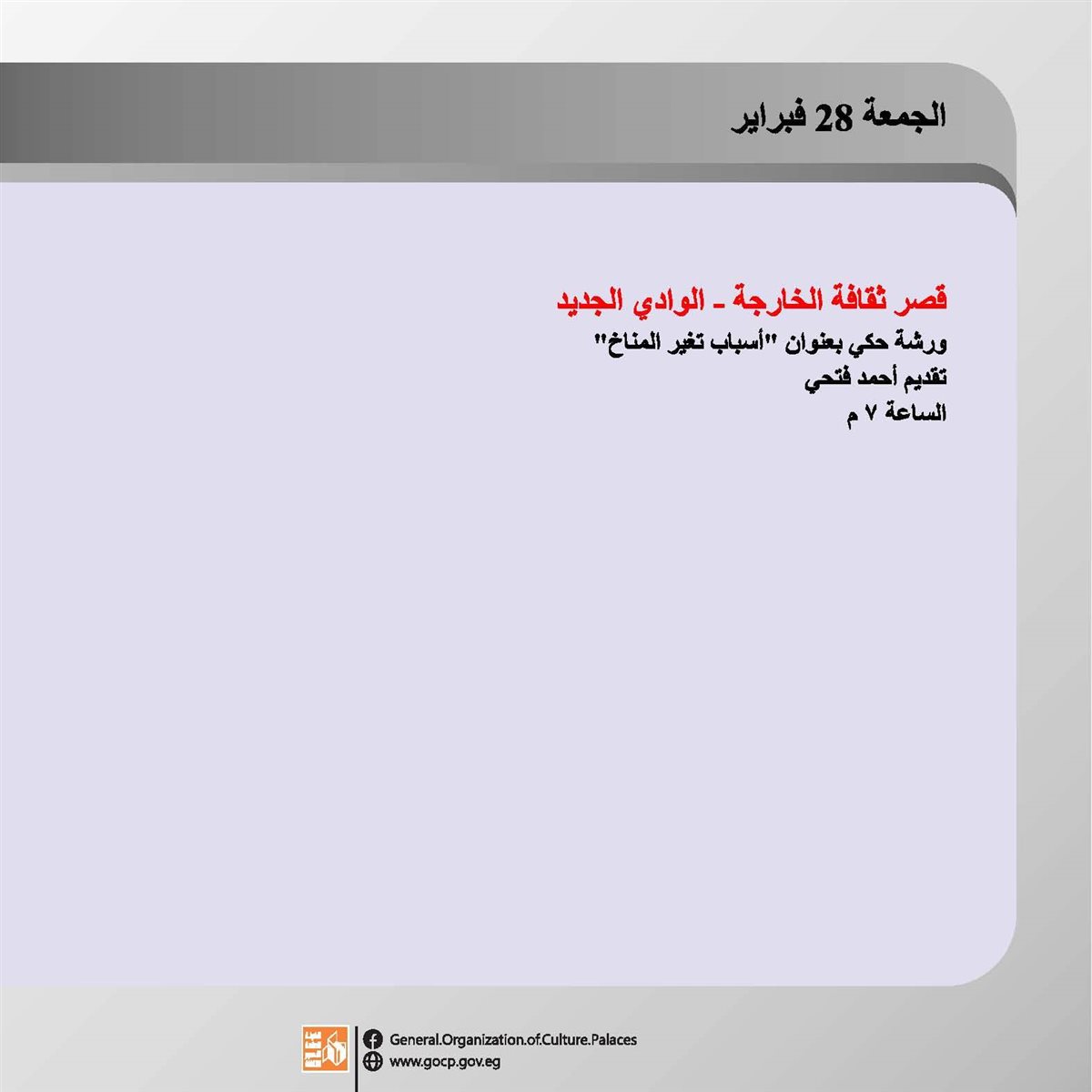 ضمن برامج وزارة الثقافة، وبرعاية الدكتور أحمد فؤاد هنو، وزير الثقافة، تقدم الهيئة العامة لقصور الثقافة، برئاسة اللواء خالد اللبان، أچندة ثرية بالفعاليات الثقافية والفنية، بدءا من اليوم الأحد وحتى السبت المقبل 1 مارس 2025.