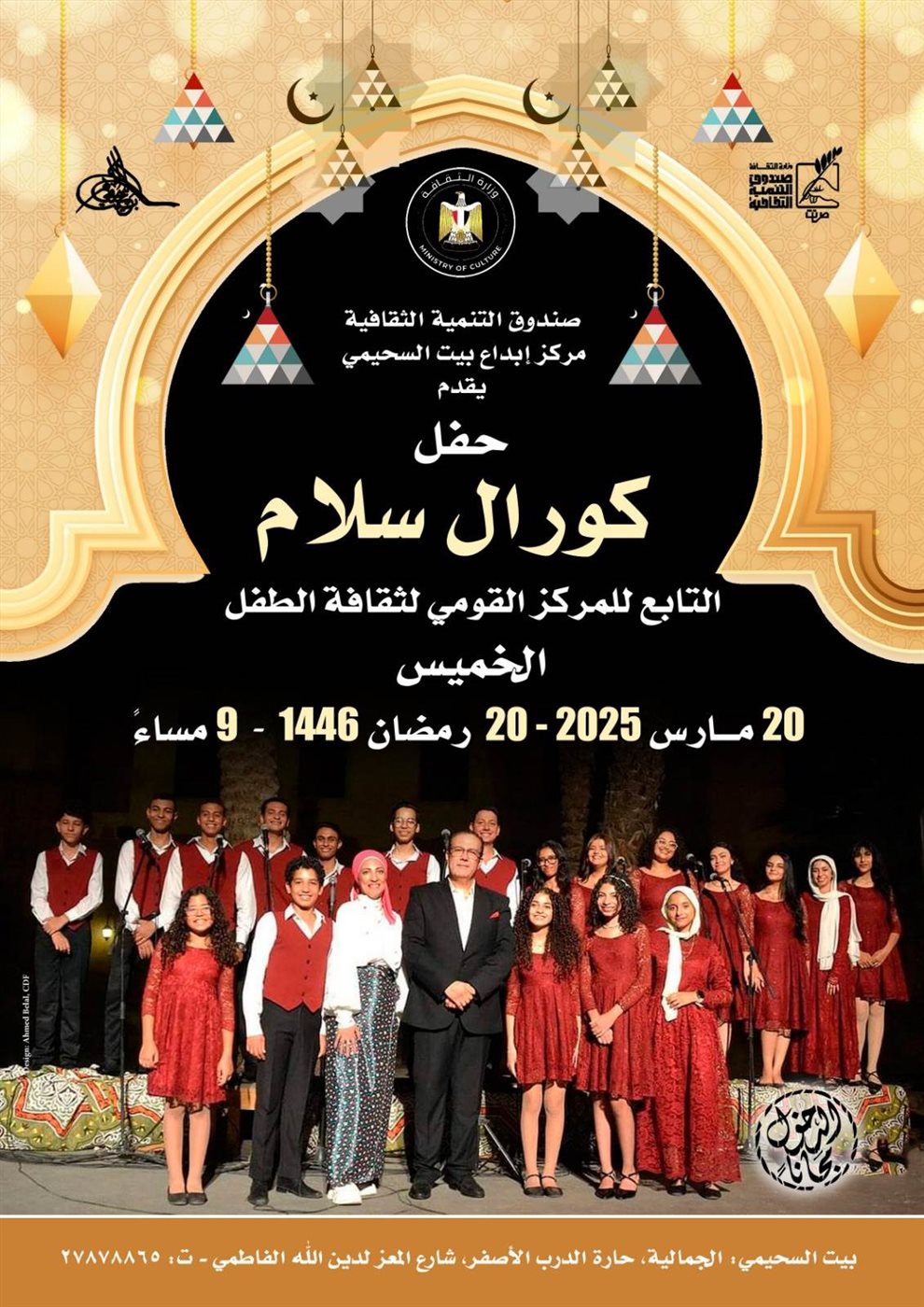 وفي بيت السحيمي بشارع المعز، يقدم 'كورال سلام" التابع لـ المركز القومي لثقافة الطفل، بقيادة المايسترو وائل عوض، باقة من الأغاني الموجهة للأطفال، التي تجمع بين الترفيه والتعليم، في أجواء فنية مليئة بالبهجة.