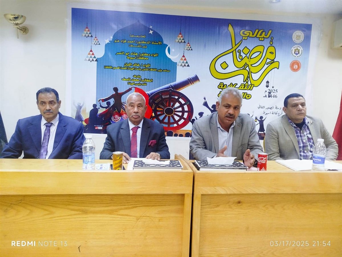 شهد قصر ثقافة أسيوط استمرار فعاليات ليالي رمضان الثقافية والفنية التي تنظمها الهيئة العامة لقصور الثقافة برئاسة اللواء خالد اللبان، ضمن برنامجها المركزي المعد للاحتفال بالشهر الكريم، في إطار برامج وزارة الثقافة.