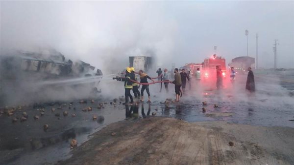 نشب حريق هائل بسيارة نقل تريلا، أثناء انقلابها بالطريق الصحراوي “القاهرة - الإسكندرية”، بدائرة قسم شرطة غرب النوبارية بمحافظة البحيرة.