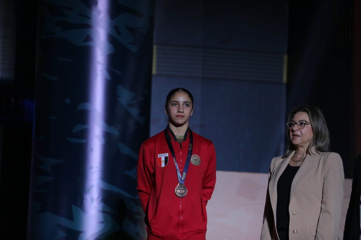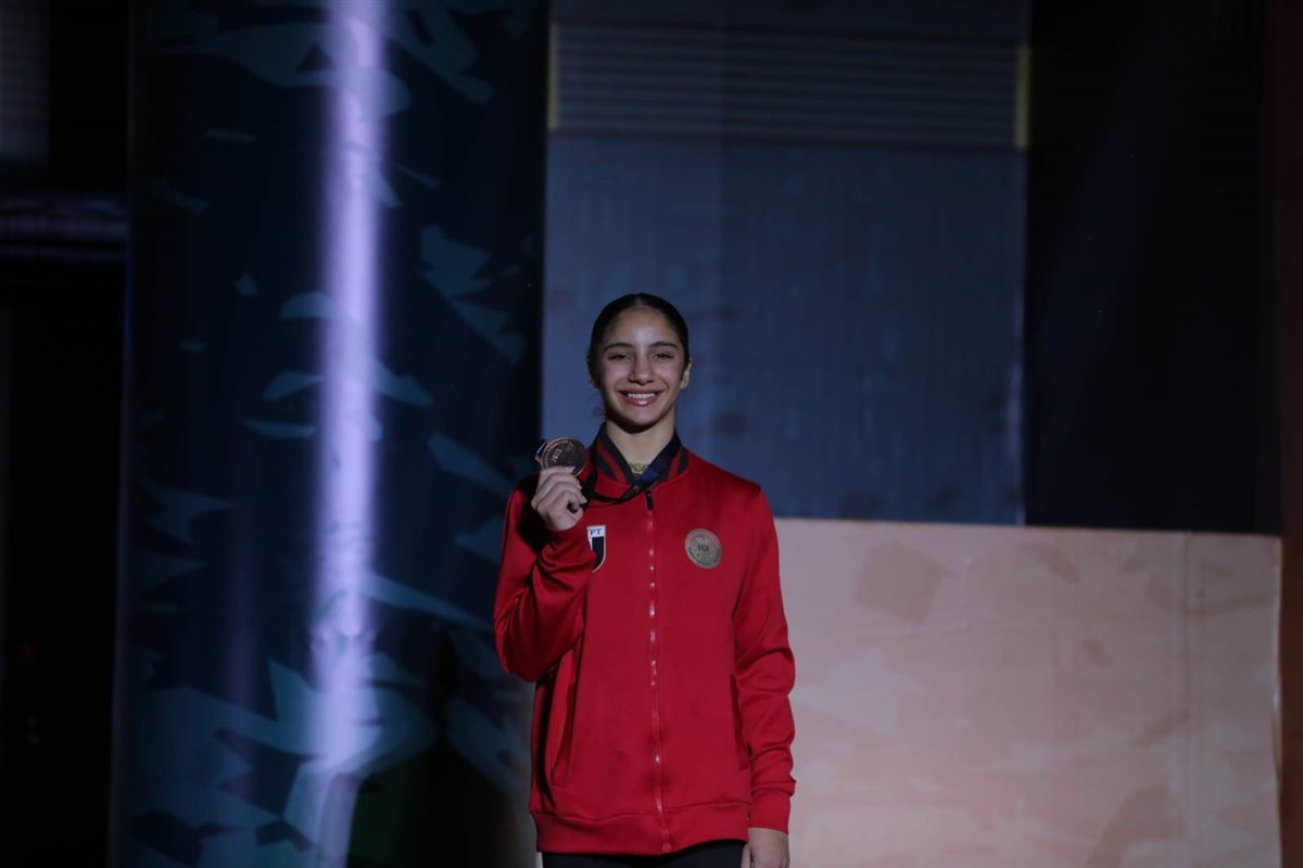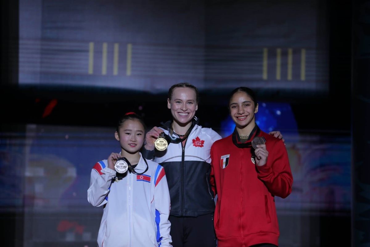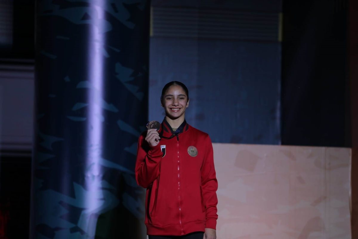 وفازت جودي عبدالله بالميدالية البرونزية خلال مشاركتها في نهائيات جهاز حصان القفز ببطولة كأس العالم للجمباز الفني