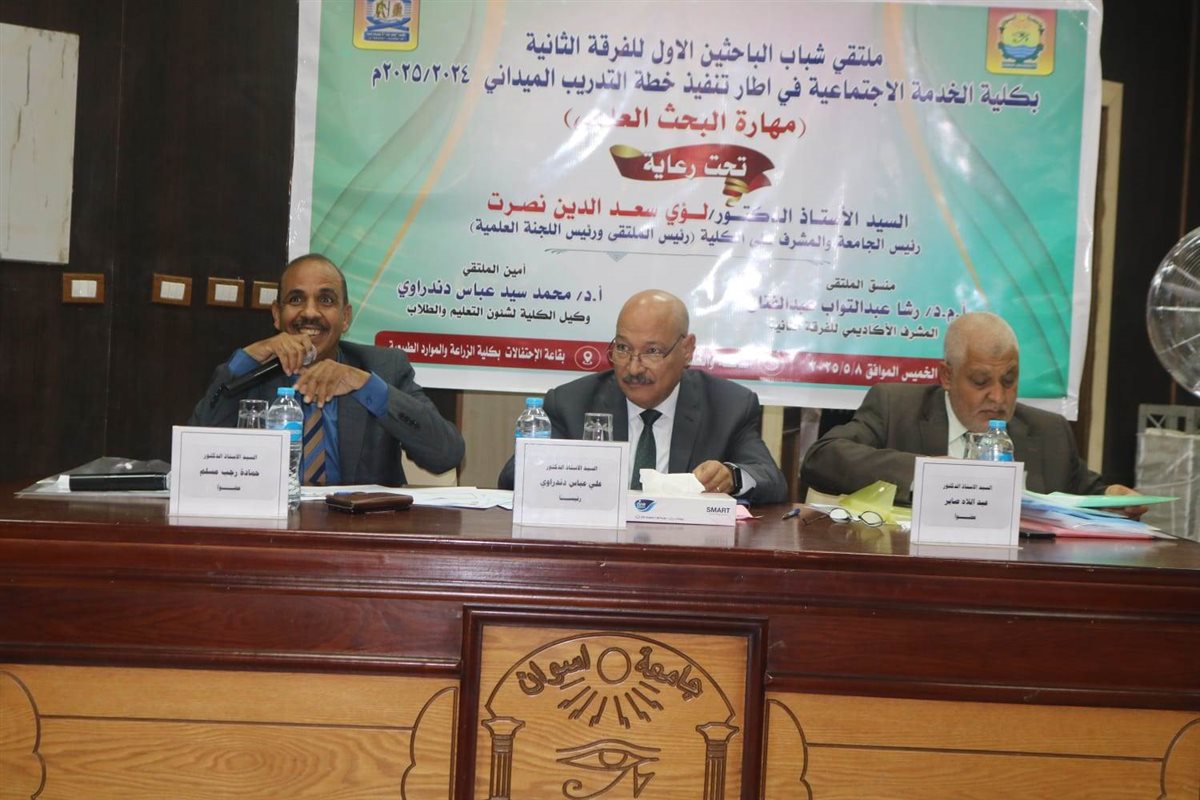 شهد الدكتور لؤي سعد الدين نصرت، القائم بأعمال رئيس جامعة أسوان ،فعاليات ملتقى شباب الباحثين الأول لطلاب الفرقة الثانية بكلية الخدمة الاجتماعية، وذلك تحت عنوان: "مهارات البحث العلمي، بحضور الدكتور علي دندراوي نائب رئيس الجامعة السابق، والدكتور محمد سيد دندراوي وكيل كلية الخدمة الاجتماعية لشؤون التعليم والطلاب وامين الملتقي، والدكتورة رشا عبد التواب المشرف الأكاديمي ومنسق الملتقى، إلى جانب عدد من أعضاء هيئة التدريس ومعاونيهم وطلاب الجامعة.