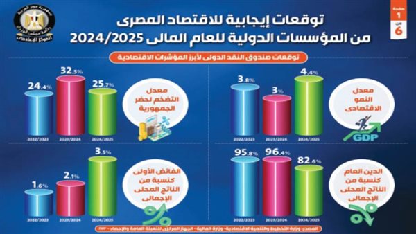 ويتوقع صندوق النقد الدولى، أن يشهد الاقتصاد المصري نموًا بنسبة 4% فى عام 2025 مقارنًة بنمو متوقع بنسبة 2.7% فى 2024، ومن المتوقع أيضًا أن يرتفع الناتج المحلى الإجمالى بالأسعار الثابتة إلى 8.7 تريليونات جنيه فى 2025 مقابل 8.4 تريليونات جنيه فى 2024، كما يتوقع ارتفاع الناتج المحلى الإجمالى بالأسعار الجارية ليصل إلى 17.5 تريليون جنيه فى 2025 مقارنةً بنحو 13.8 تريليون جنيه فى 2024.