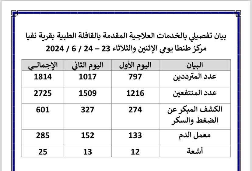 وتأتي القافلة التي انطلقت أمس الاثنين وتستمر حتى الثلاثاء 24 يونيو 2025، تحت شعار "صحتك بالدنيا"، بالتعاون مع وزارة الصحة، في إطار جهود الحزب لدعم المواطنين وتقديم خدمات طبية شاملة مجانية خاصة في المناطق الريفية، ولذلك لخدمة أهالي قرى نفيا، وكفر أبو داود، وميت حبيش القبلية، ودفرة بمركز طنطا، حيث تقدم خدمات طبية متعددة تشمل فحوصات طبية، صرف أدوية، أشعة، وتحاليل مخبرية مجانية، إلى جانب التخصصات الطبية المختلفة مثل الباطنة، الأطفال، النساء وتنظيم الأسرة، العظام، الجراحة، المسالك، الجلدية، الصدر، الأنف والأذن، الرمد، والأسنان.