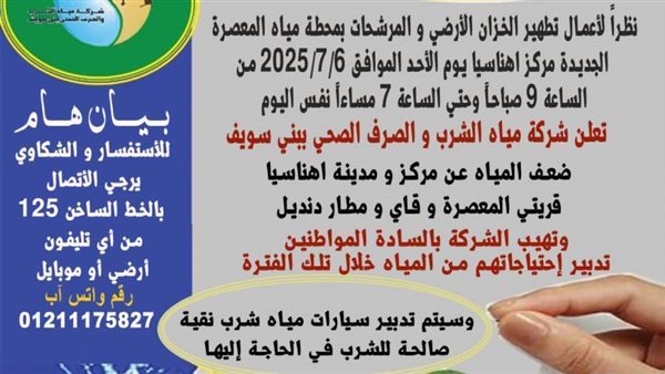 أعلنت شركة مياه الشرب والصرف الصحي ببني سويف، أنه نظرًا للقيام بأعمال تطهير للخزان الأرضي والمُرشحات بمحطة مياه معصرة نعسان الجديدة، فقد تقرر ضعف المياه عن مركز ومدينة أهناسيا وقريتي المعصرة وقاي، بجانب مطار دنيل بمركز ناصر، وذلك يوم الأحد المقبل 6 يوليو الجاري، اعتباراً من الساعة 9 صباحًا حتى الساعة 7 مساء نفس يوم الأحد.