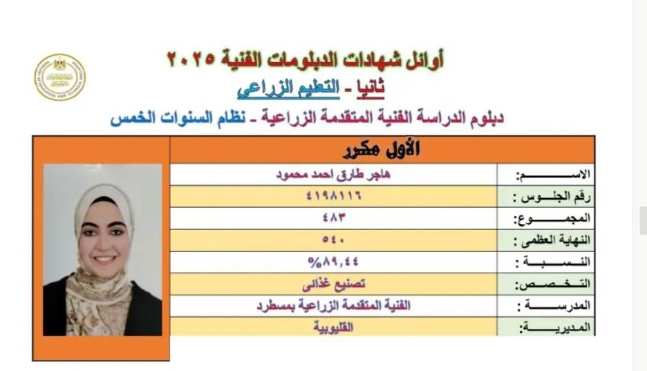 هنأ المهندس أيمن عطية، محافظ القليوبية، هاتفيًا، اثنتين من بناته الطالبات اللاتي حققن المركز الأول مكرر على مستوى الجمهورية في الدبلومات الفنية للعام الدراسي الحالي. هذا التفوق يؤكد على الجهود المبذولة في قطاع التعليم الفني بالمحافظة. حيث هنأ المحافظ الطالبتان " هاجر طارق أحمد محمود" و "ملك عبد المجيد محمد شلبى"، وكلاهما من المدرسة الفنية المتقدمة الزراعية بمسطرد، تخصص تصنيع غذائى، وحققت كلتاهما مجموعًا قدره 483 درجة، بنسبة مئوية بلغت 89.44%، ليشاركا سويًا في قمة قائمة أوائل الجمهورية.
