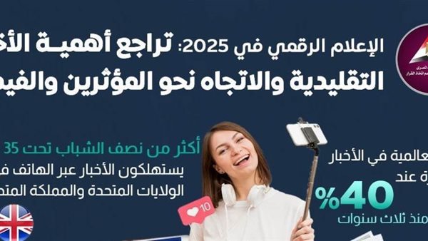 أعد مركز المعلومات ودعم اتخاذ القرار بمجلس الوزراء المصري، انفوجرافًا نشره عبر صفحته الرسمية على موقع التواصل الاجتماعي "فيسوك"، عن دراسة حديثة لوكالة رويترز يتضمن ملامح الإعلام الرقمي في 2025، مؤكدةً تراجع الأخبار التقليدية وصعود المؤثرين والفيديو.
