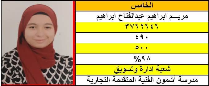 أحرزت الطالبة "مريم إبراهيم عبدالفتاح إبراهيم"، بالصف الخامس شعبة "إدارة وتسويق" بمدرسة أشمون التجارية المتقدمة، المركز الخامس على مستوى الجمهورية، بعد حصولها على مجموع 490 درجة بنسبة 98%، محققة بذلك حلمها بالالتحاق بكلية التجارة.