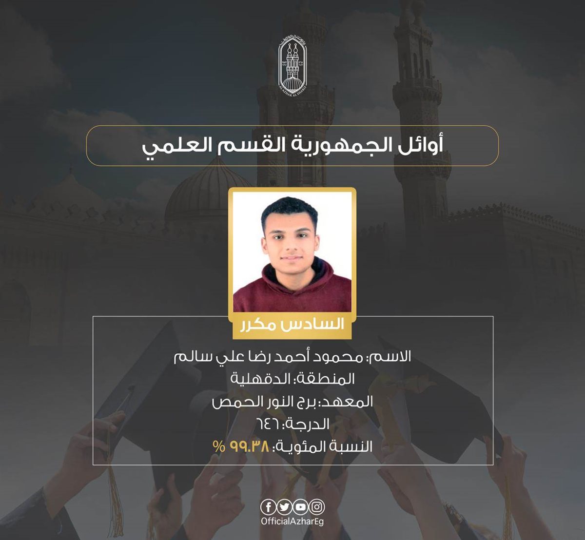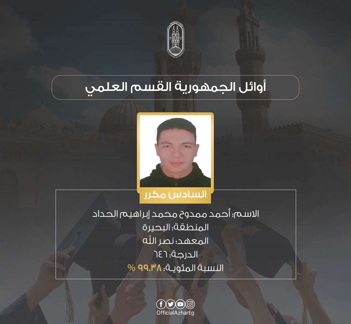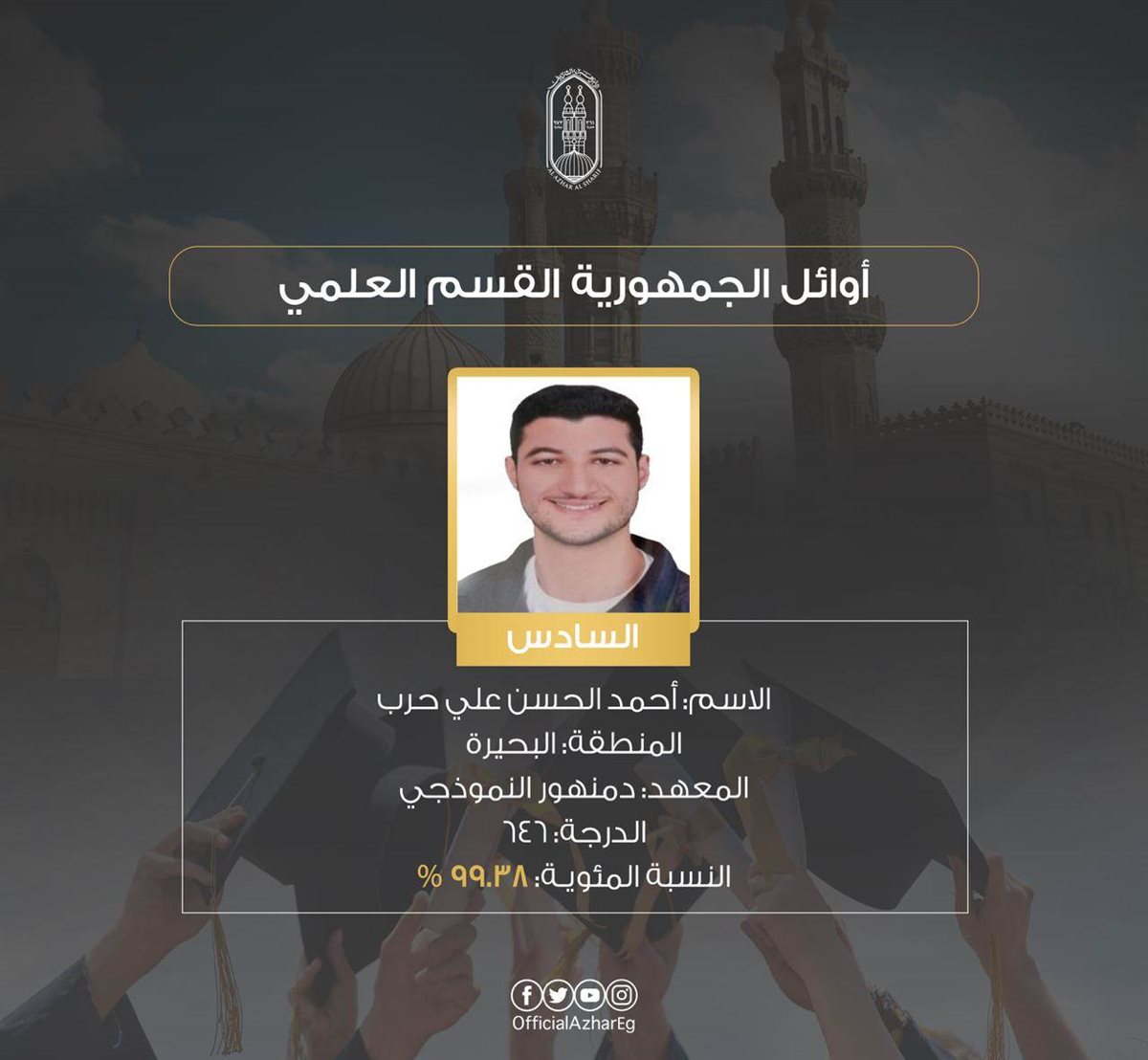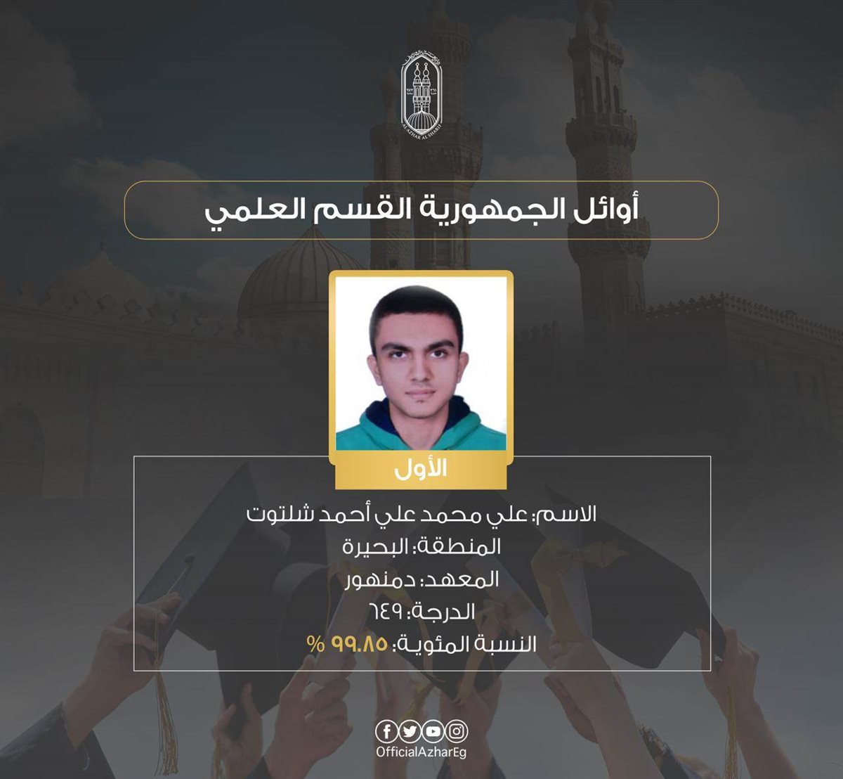 المركز الأول علي محمد علي أحمد شلتوت منطقة البحيرة – معهد دمنهور 649 درجة – 99.85%