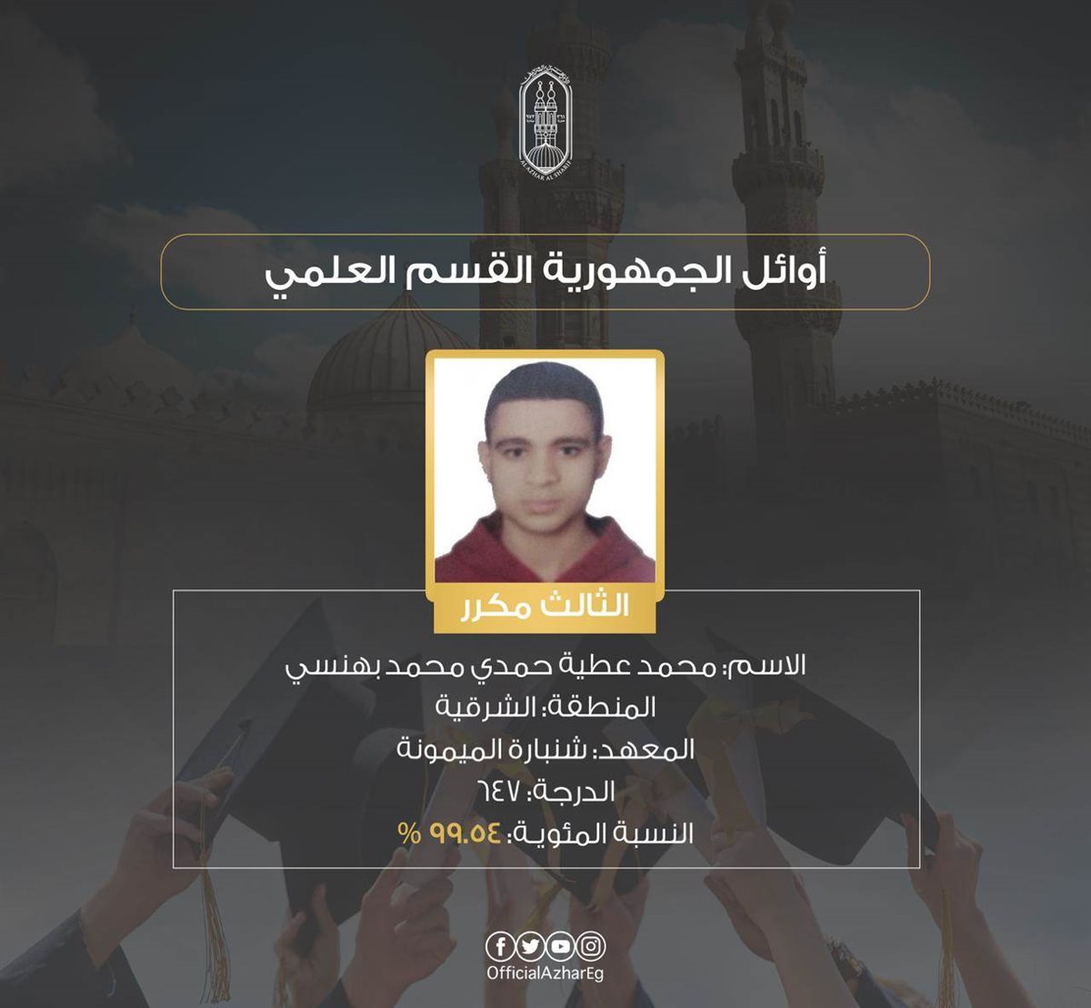 المركز الثالث مكرر محمد عطية حمدي محمد بهنسي منطقة الشرقية – معهد شنبارة الميمونة 647 درجة – 99.54%