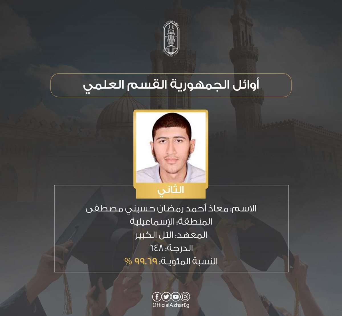 المركز الثاني معاذ أحمد رمضان حسيني مصطفى منطقة الإسماعيلية – معهد التل الكبير 648 درجة – 99.69%