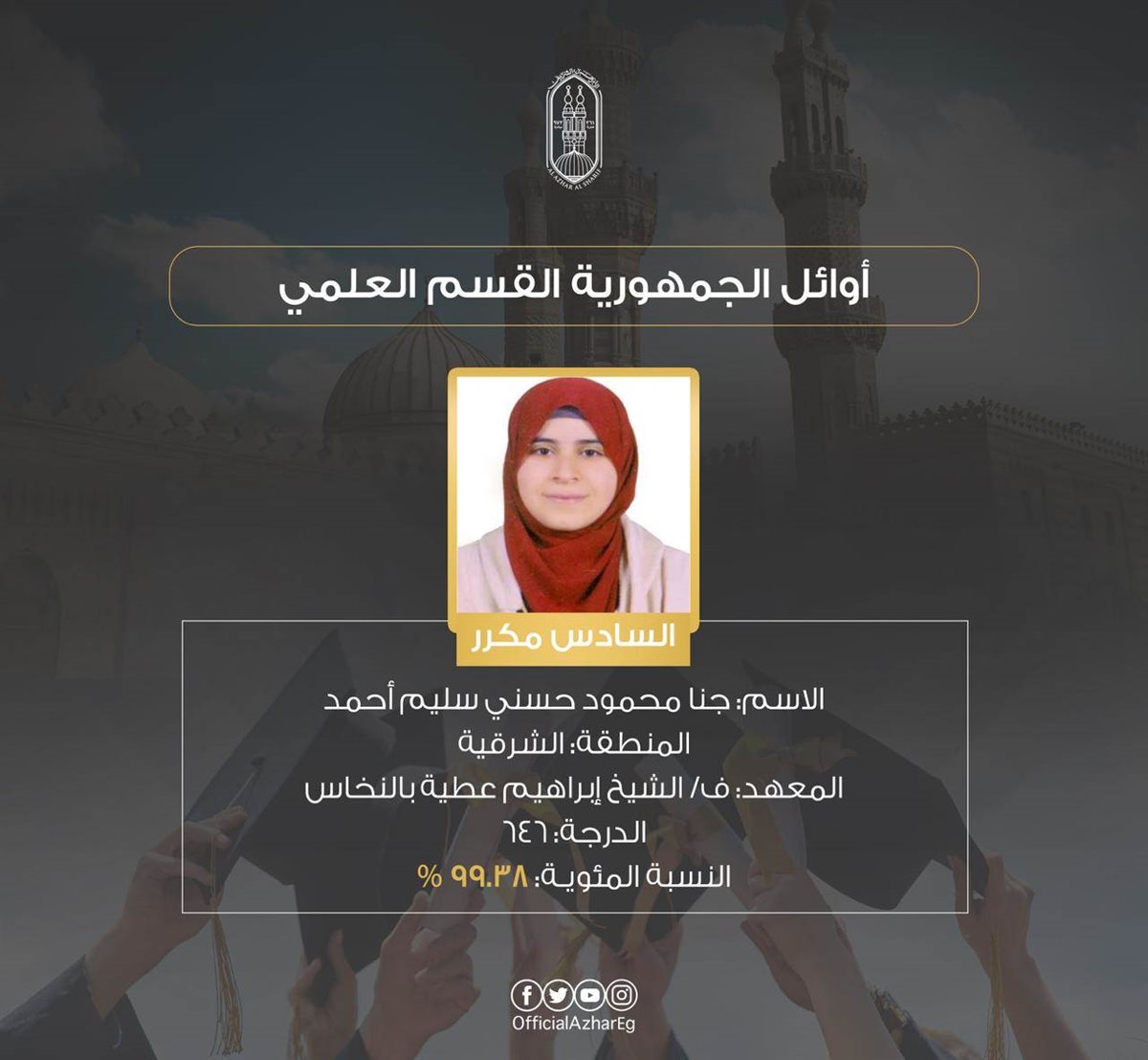 وجاء أوائل القسم العلمي بالشهادة الثانوية الأزهرية على النحو التالي: