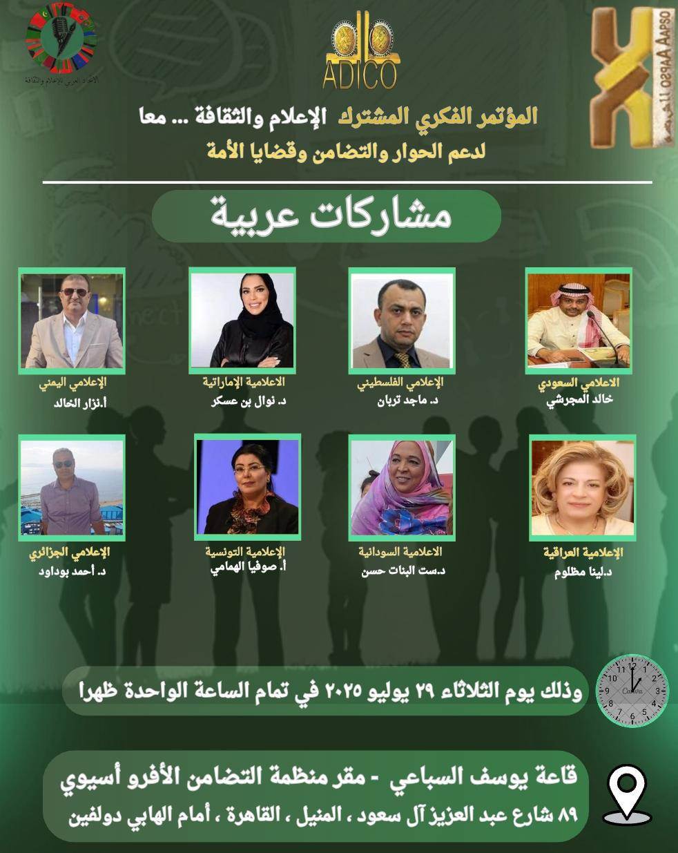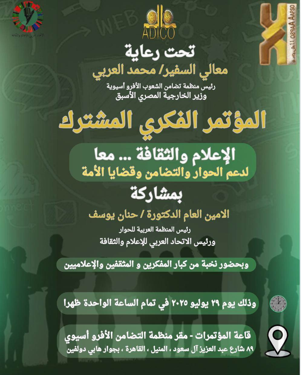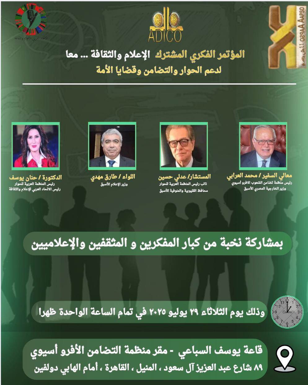 شهدت قاعة الأديب الراحل يوسف السباعي، بمقر منظمة تضامن الشعوب الأفروآسيوية بالقاهرة، انعقاد المؤتمر الفكري الأول الذي نظمه الاتحاد العربي للإعلام والثقافة التابع للمنظمة العربية للحوار والتعاون الدولي، بالتعاون مع منظمة تضامن الشعوب الأفروآسيوية، تحت شعار "الإعلام والثقافة... معًا لدعم الحوار والتضامن وقضايا الأمة"، وسط حضور رفيع المستوى من النخبة الإعلامية والثقافية والسياسية.