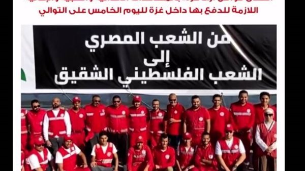 نشر الهلال الأحمر المصري، مقطع فيديو عبر صفحته الرسمية على موقع التواصل الاجتماعي "فيسبوك"، يرصد انطلاق قوافل "زاد عزة" بالمساعدات الغذائية والطبية والإغاثية اللازمة للدفع بها داخل غزة لليوم الخامس على التوالي.