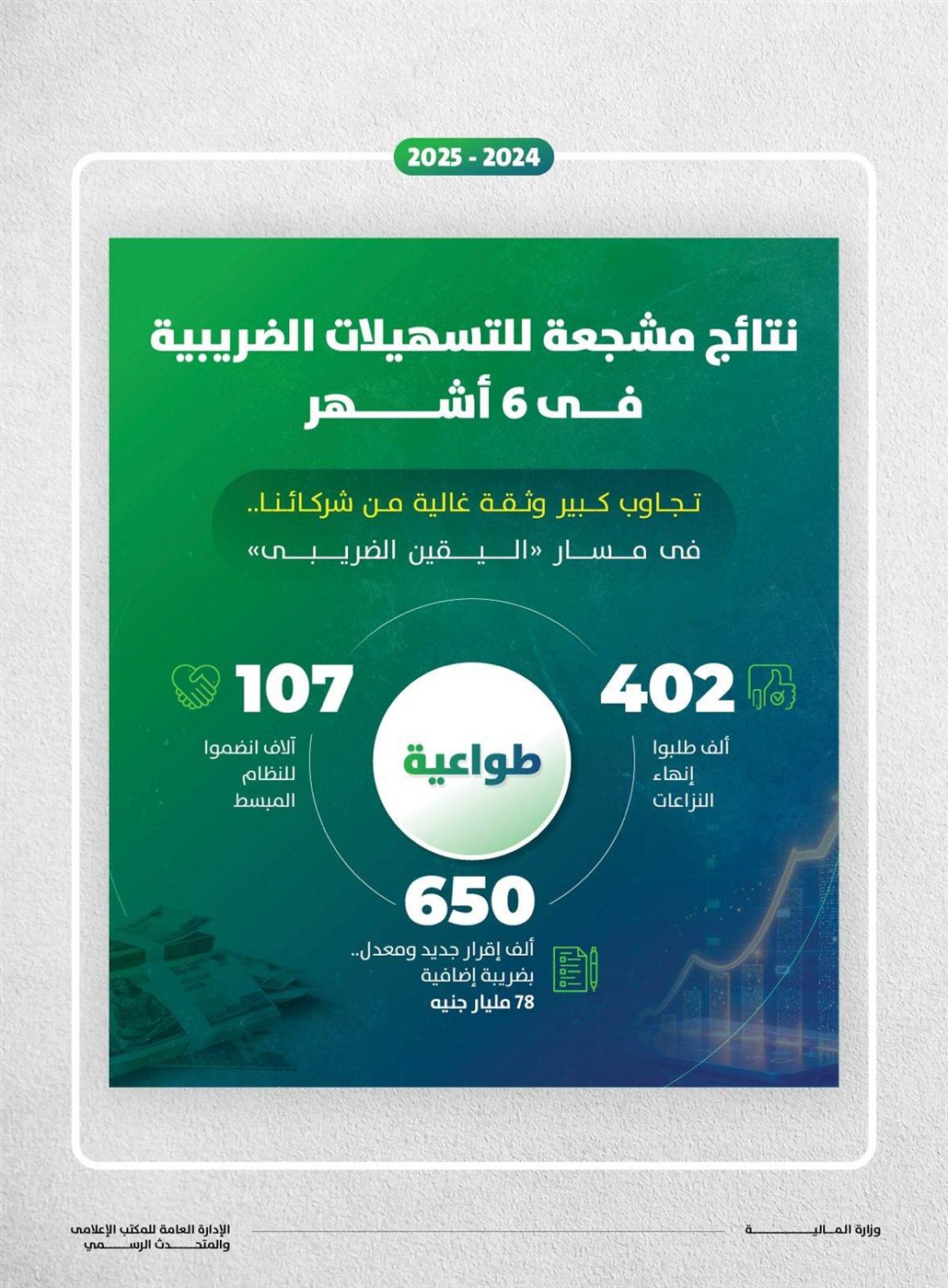 أضاف الوزير، أن نتائج حزمة التسهيلات الضريبية في ٦ أشهر جاءت مشجعة، مما يدفعنا لاستكمال المشوار وإطلاق حزم متتالية من التيسيرات، موضحًا أن نحو ٤٠٢ ألف طلبوا إنهاء النزاعات الضريبية و١٠٧ آلاف انضموا للنظام المبسط طواعية حتى الآن، وتم تقديم نحو ٦٥٠ ألف إقرار جديد ومعدل بضريبة إضافية بقيمة ٧٨ مليار جنيه «طواعية».