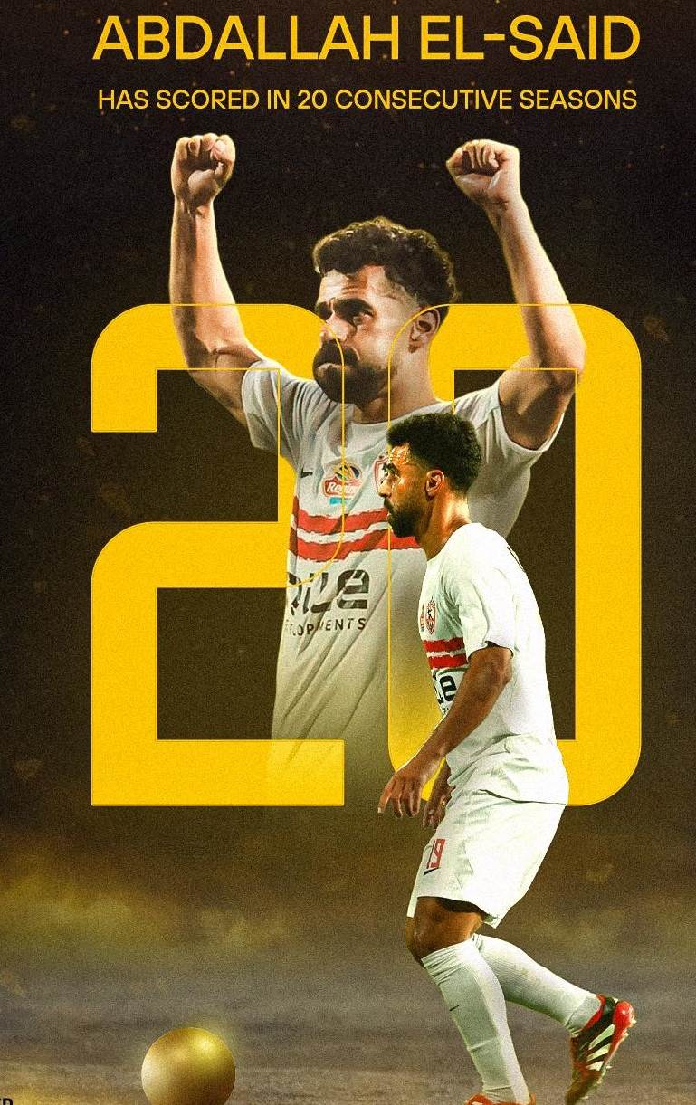 وتحت عنوان "مالوش بديل" نشرت صفحة نادي الزمالك بوستر لـ عبدالله السعيد احتفالا بتسجيله الأهداف للموسم العشرين على التوالي في الدوري الممتاز.
