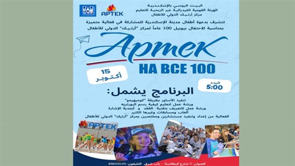 ومن جانبه قال مدير البيت الروسي بالإسكندرية ارسيني ماتيوسشينكو أن الفعالية تأتي بمناسبة الاحتفال بيوبيل 100 عاماً لمركز "أرتيك" الروسي الدولي للأطفال مشيرا إلى أن البرنامج يشمل ورشة عمل لتعليم كيفية رسم البورتريه بالإضافة إلى ورشة عمل للتعريف بتقنية العقد و أبجدية الإشارة مؤكدا أن الفاعلية يقوم على تنفيذها وإعدادها مستشارين ومختصين بمركز "أرتيك" الدولي الأطفال .