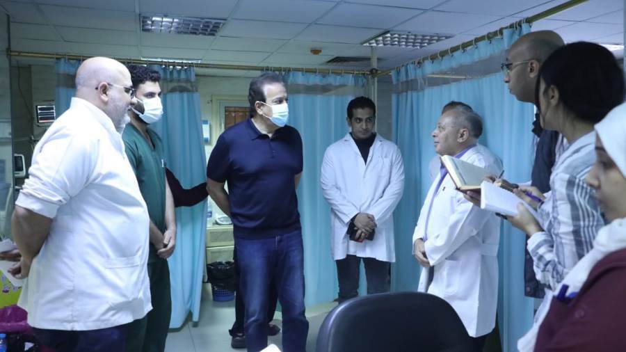 وقال الدكتور حسام عبدالغفار المتحدث الرسمي لوزارة الصحة والسكان، إن الوزير، اطلع على كشوفات سجل استقبال الطوارئ عن اليوم، واطمأن على حجم الإشغال ومعدل الترددات للمستشفى، ثم اتجه لتفقد وحدة الرعاية المركزة بقوة 10 أسرة، ويشغلها حاليا 9 حالات، حرص على تفقدهم والاطمئنان على حالتهم الصحية.