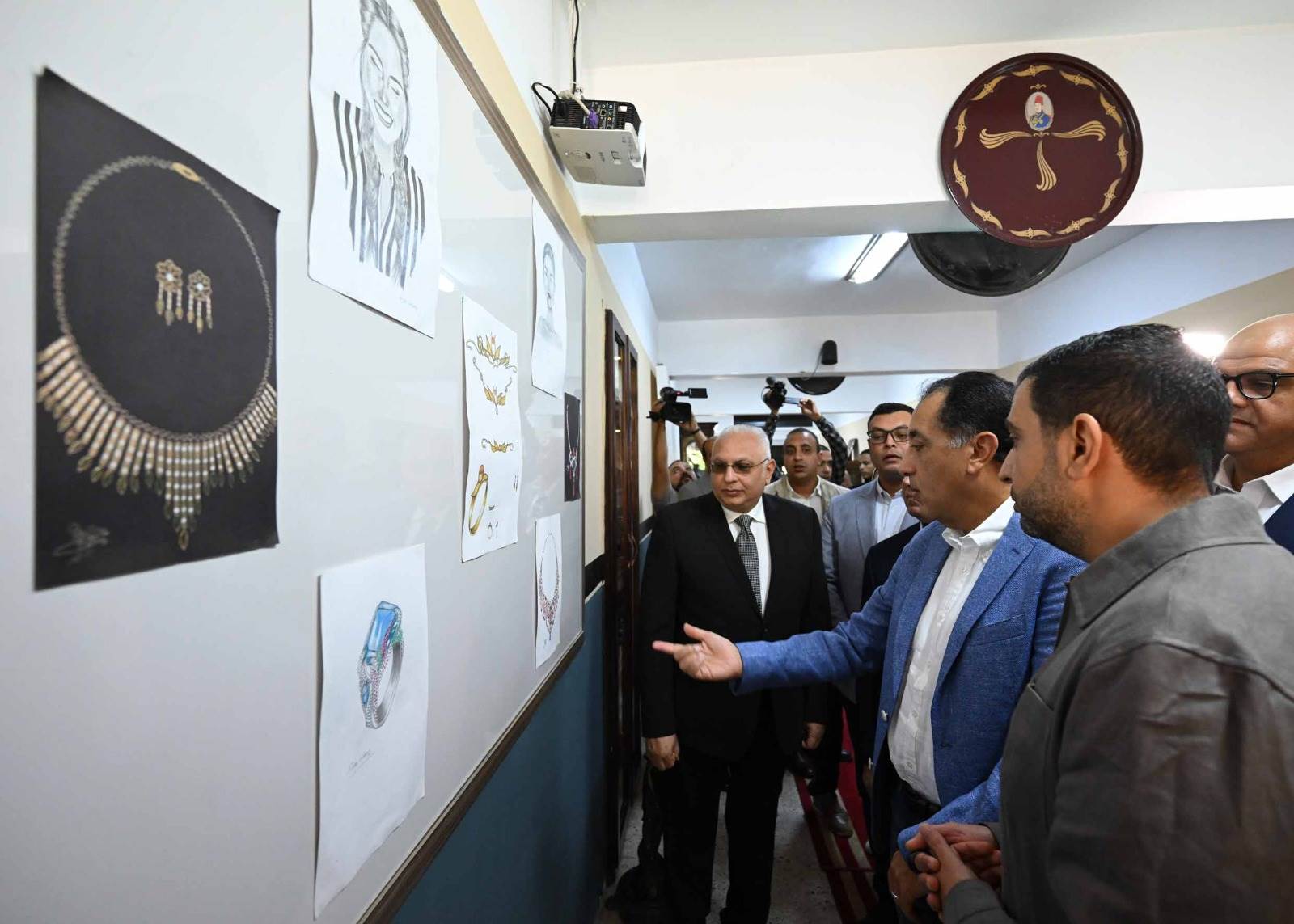 كما اطلع رئيس الوزراء على عدد من تصميمات الطلاب في قسم التصميم بالمدرسة، ونماذج للرسومات المستوحاة من الطبيعة، مؤكداً خلال حواره مع الطلاب على أهمية ما تقدمه المدرسة من دراسة تطبيقية متخصصة، يمكن الاستفادة منها فى إقامة شركات ومشروعات صغيرة، أو الدخول في شراكات مع شركات عالمية متخصصة في مجال الحلي، كما تعرف على ما يتم اتاحته من فرص عمل سواء داخل مصر أو خارجها.