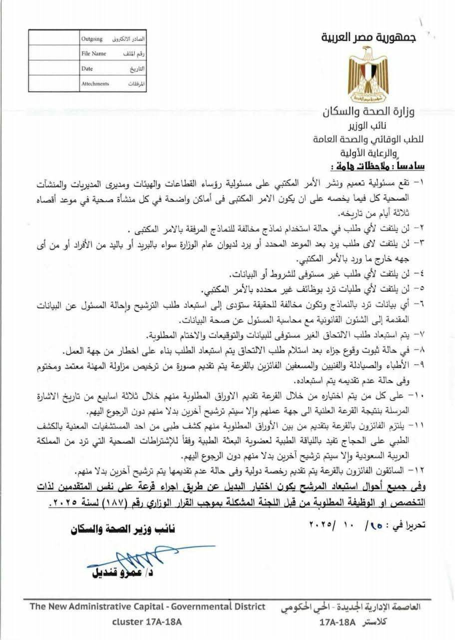 ألزمت الوزارة رؤساء القطاعات ومديري المديريات الصحية بنشر الأمر المكتبي في أماكن ظاهرة بجميع المنشآت الصحية خلال 3 أيام من تاريخ صدوره، مع تحملهم المسؤولية الكاملة عن تنفيذ التعليمات ومتابعة التقديم الإلكتروني.