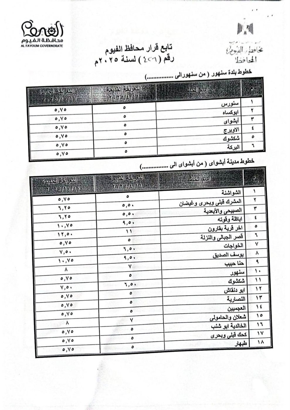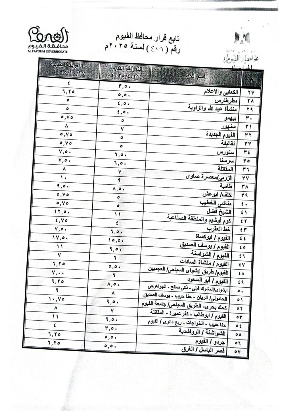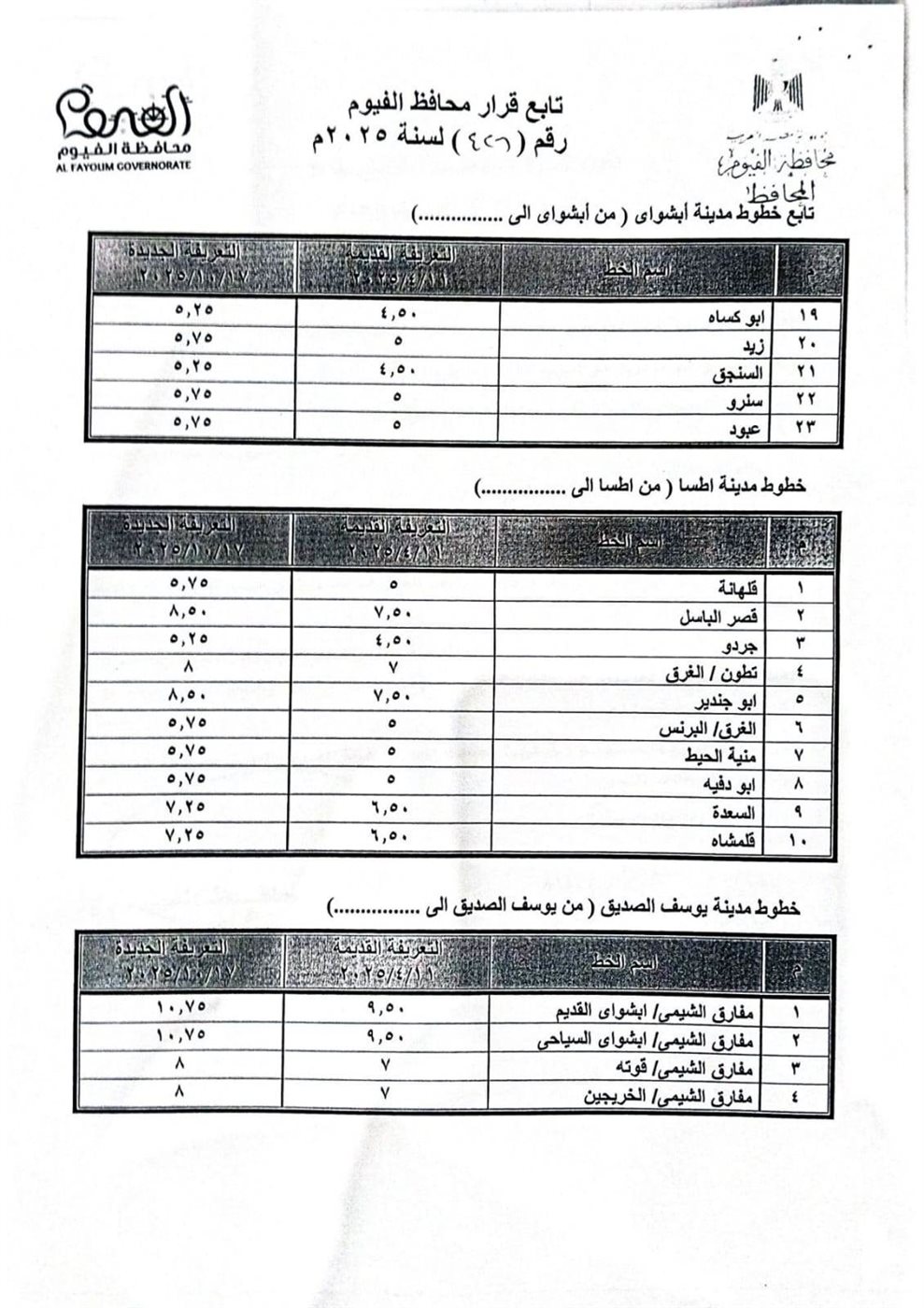 أعلنت محافظة الفيوم تعريفة الركوب الجديدة لخطوط سير السرفيس والتاكسي وسيارات الأجرة العاملة على الخطوط الداخلية والخارجية بين مراكز المحافظة، والمحافظات الأخرى، وذلك بعد إعلان لجنة التسعير التلقائي للمنتجات البترولية، تحريك أسعار البنزين والسولار، بدءاً من صباح اليوم الجمعة 17 اكتوبر 2025.