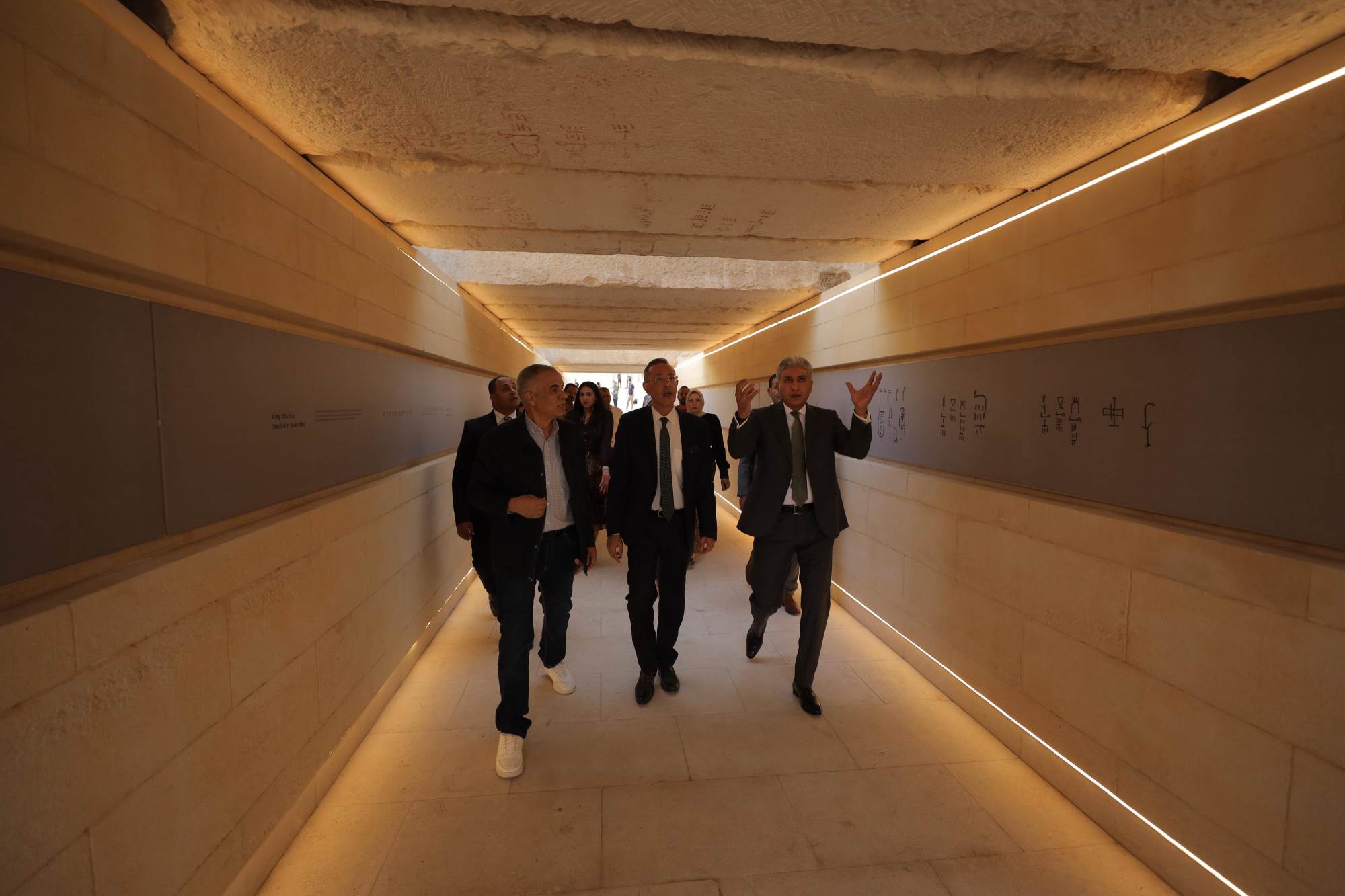 وقد رافق الوزير خلال هذه الجولات كل من الدكتور أحمد غنيم الرئيس التنفيذي لهيئة المتحف المصري الكبير، والأستاذة رنا جوهر مستشار الوزير للتواصل والعلاقات الخارجية والمُشرف العام على الإدارة العامة للعلاقات الدولية والاتفاقيات بالوزارة، والدكتور عيسى زيدان مدير عام الترميم ونقل الآثار بالمتحف.