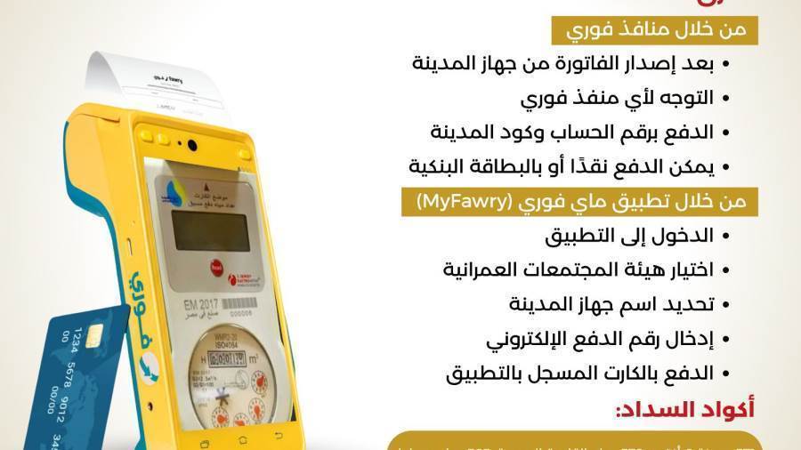 تنفيذًا لتوجيهات المهندس شريف الشربيني، وزير الإسكان والمرافق والمجتمعات العمرانية، بالتيسير على المواطنين في طرق سداد فواتير استهلاك المياه للعدادات الميكانيكية بالمدن الجديدة التابعة لهيئة المجتمعات العمرانية الجديدة، أعلنت وزارة الإسكان أنه تمت إتاحة السداد لفواتير مياه تلك العدادات من خلال منافذ فوري وتطبيق الهاتف المحمول "ماي فوري".