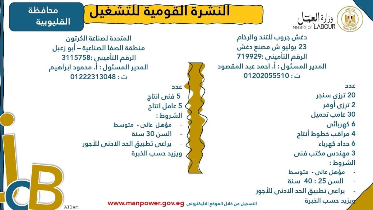 أصدرت وزارة العمل اليوم الجمعة نشرة التوظيف نصف الشهرية التي تتضمن فرص عمل جديدة متاحة في مختلف المحافظات بالتعاون مع شركات القطاع الخاص، وذلك في إطار جهود الدولة المستمرة لتوفير فرص عمل لائقة للشباب، وتنفيذًا لتوجيهات القيادة السياسية بدمج مختلف فئات المجتمع في سوق العمل، وعلى رأسهم ذوو الهمم.