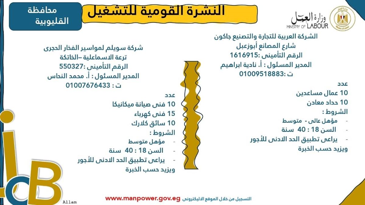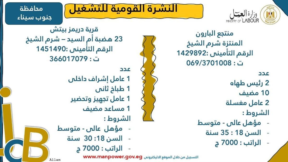 وأوضحت الوزارة في بيانها أن 107 شركات من القطاع الخاص في 16 محافظة قد أبدت استعدادها لتوفير 6721 فرصة عمل جديدة في عدد من التخصصات والمهن المختلفة، منها فرص مخصصة لأصحاب القدرات الخاصة (ذوي الهمم)، برواتب مجزية تُحدد وفقًا لطبيعة المقابلة الشخصية، مع الالتزام الكامل بتطبيق الحد الأدنى للأجور، فضلًا عن الاستفادة من منظومة التأمين الصحي والاجتماعي.