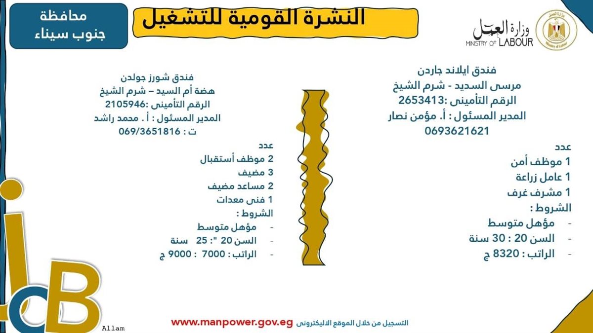 وتشمل النشرة الحالية فرصًا متاحة في 16 محافظة هي القاهرة، والمنوفية، والسويس، والقليوبية، والغربية، وبني سويف، وجنوب سيناء، وسوهاج، وأسيوط، وبورسعيد، والإسماعيلية، والإسكندرية، والبحر الأحمر، وأسوان، والمنيا.