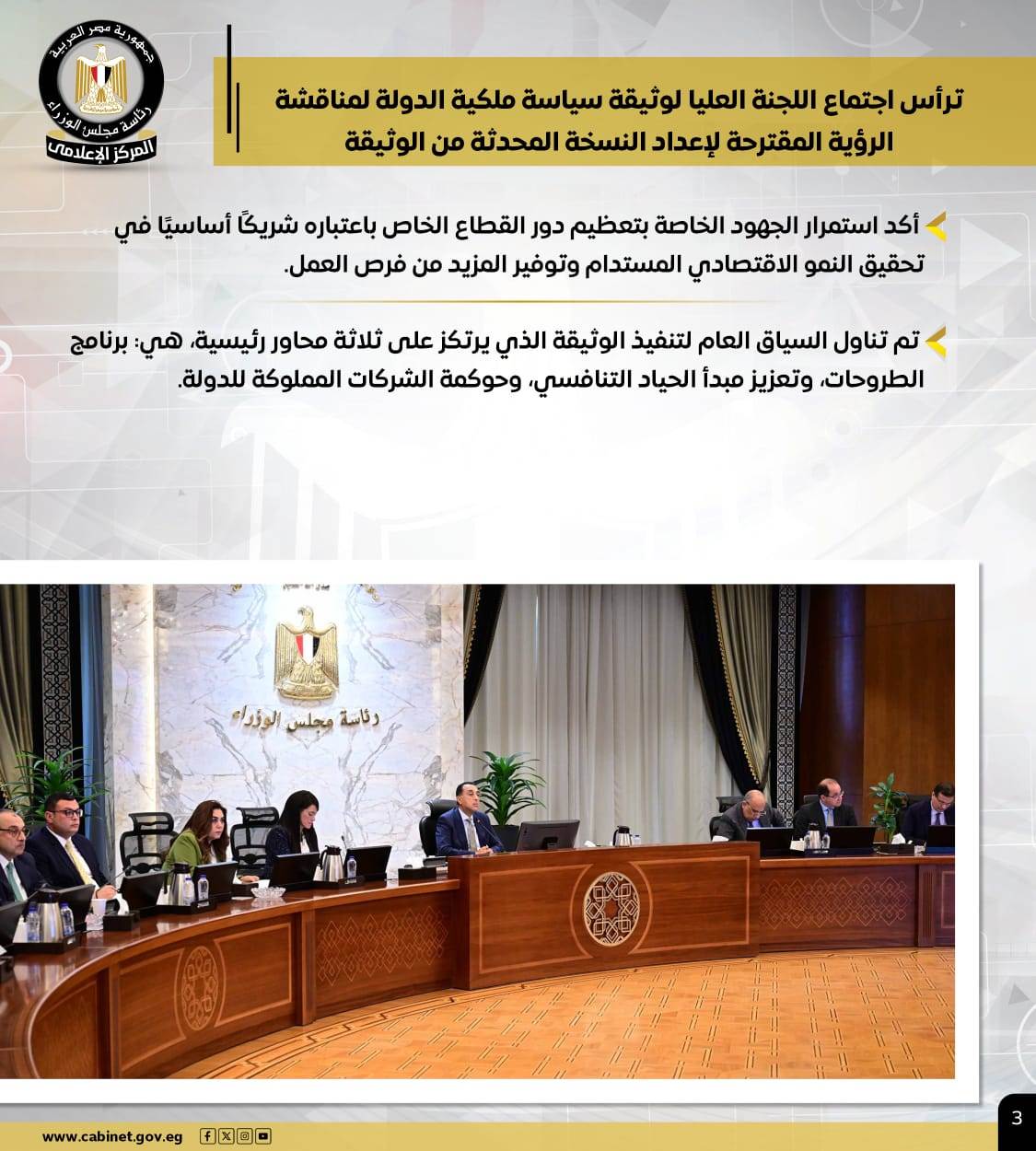 وشملت الأنشطة، ترؤس رئيس الوزراء اجتماع اللجنة العليا لوثيقة سياسة ملكية الدولة، لمناقشة الرؤية المقترحة لإعداد النسخة المحدثة من الوثيقة، مؤكدًا استمرار الجهود لتعظيم دور القطاع الخاص باعتباره شريكًا أساسيًا في تحقيق النمو الاقتصادي المستدام وتوفير فرص العمل.