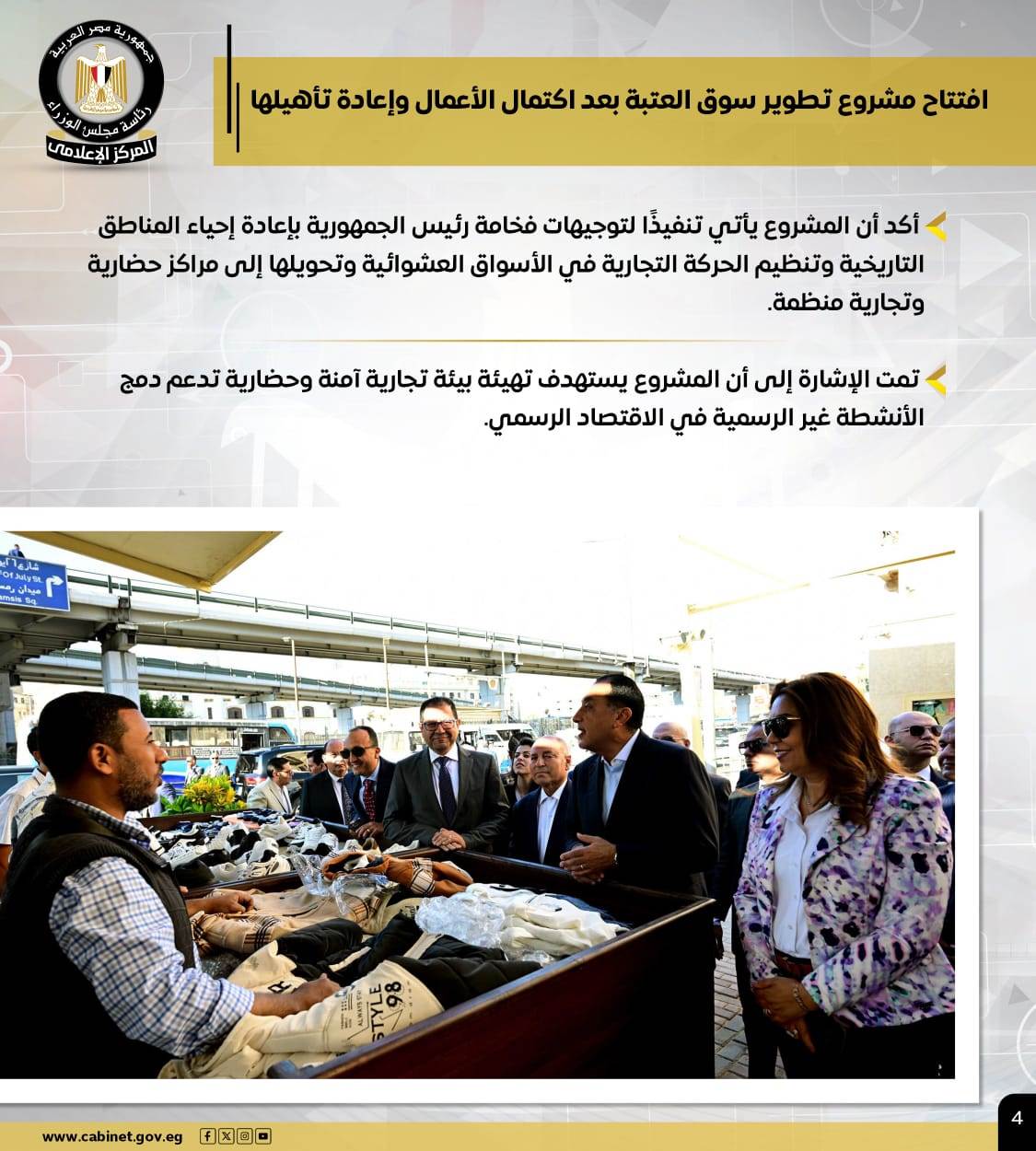 كما افتتح مشروع تطوير سوق العتبة بعد اكتمال أعمال تطويره وإعادة تأهيله، تنفيذًا للتوجيهات الرئاسية بإعادة إحياء المناطق التاريخية وتنظيم الحركة التجارية في الأسواق العشوائية وتحويلها إلى مراكز حضارية وتجارية منظمة.