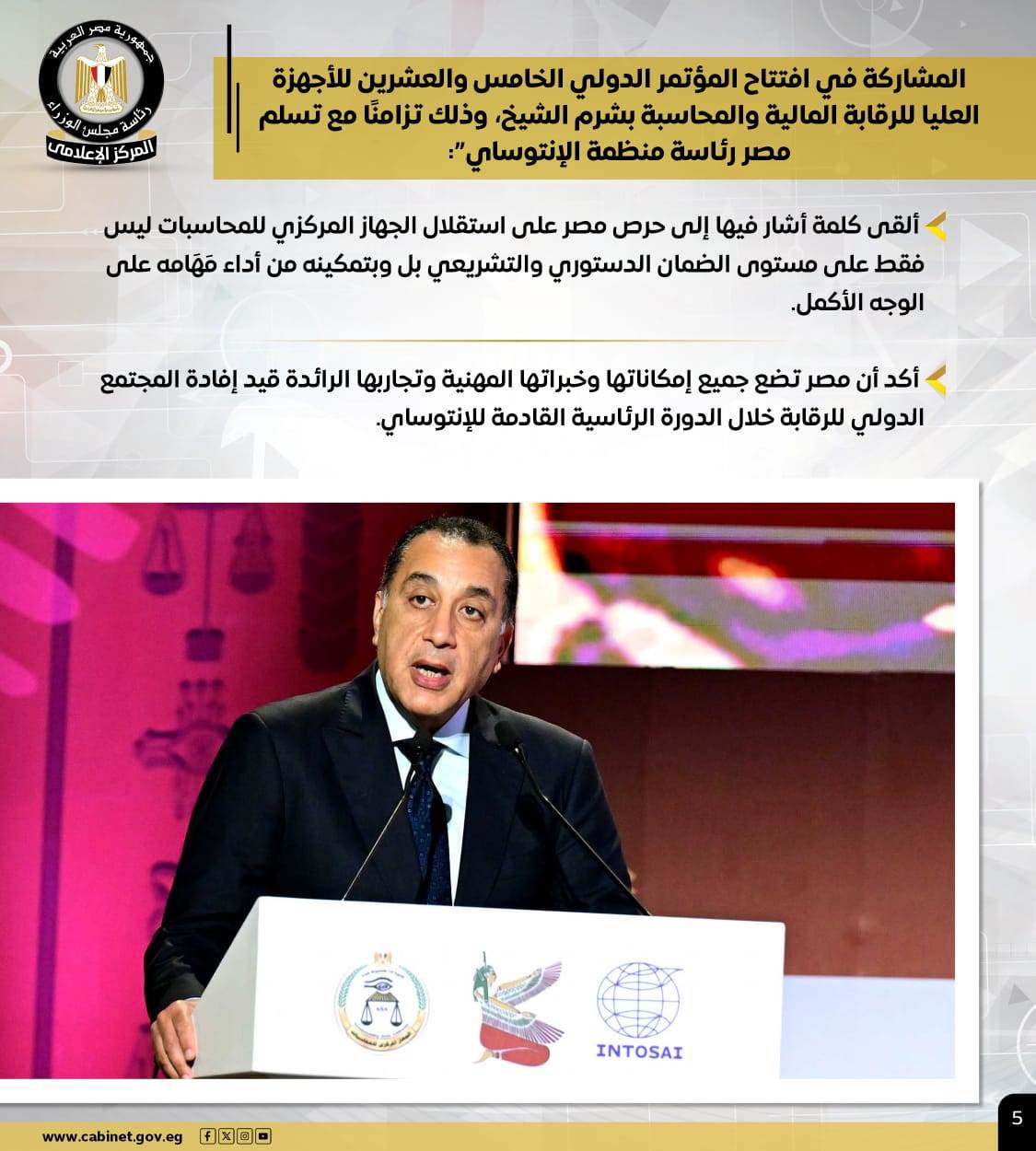 وتضمنت الأنشطة، مشاركة رئيس الوزراء في افتتاح المؤتمر الدولي الـ 25 للأجهزة العليا للرقابة المالية والمحاسبة بشرم الشيخ، تزامنًا مع تسلم مصر رئاسة منظمة "الإنتوساي"، وخلال كلمته بالمؤتمر أكد حرص الدولة على استقلال الجهاز المركزي للمحاسبات وتمكينه من أداء مهامه على الوجه الأكمل، مشيرًا إلى أن مصر تضع جميع إمكاناتها وخبراتها المهنية وتجاربها الرائدة قيد إفادة المجتمع الدولي للرقابة خلال الدورة الرئاسية القادمة للإنتوساي.