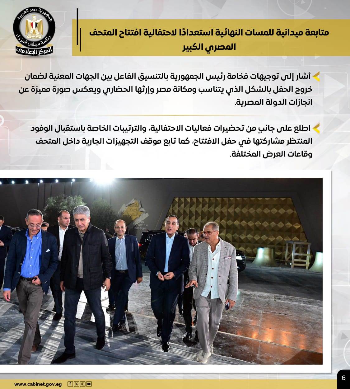 ـ قبل أيام من افتتاحه.. جولة لرئيس الوزراء لمتابعة اللمسات النهائية لاحتفالية افتتاح المتحف المصري الكبير
