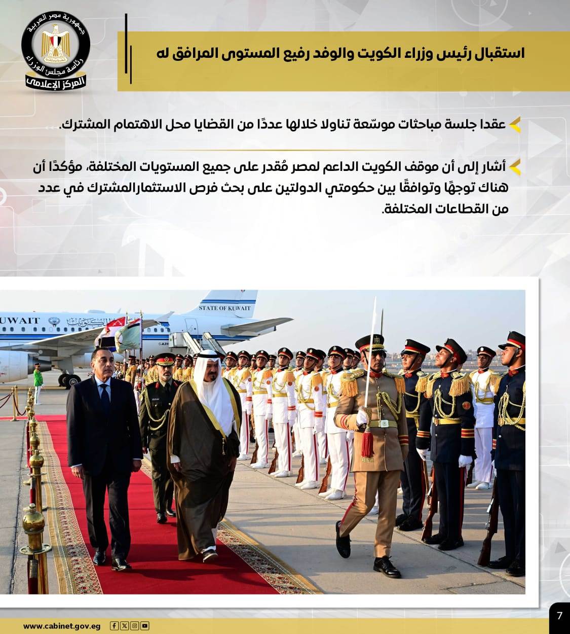 وشملت الأنشطة استقبال الشيخ أحمد عبد الله الأحمد الصباح، رئيس وزراء الكويت، والوفد رفيع المستوى المرافق له، حيث عقدا جلسة مباحثات موسعة تناولت عددًا من القضايا ذات الاهتمام المشترك، وأكد رئيس الوزراء أن موقف الكويت الداعم لمصر محل تقدير على جميع المستويات المختلفة، مشيرًا إلى التوافق بين حكومتي الدولتين على بحث فرص الاستثمار المشترك في عدد من القطاعات المختلفة.